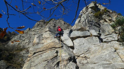 La descrizione del percorso di accesso è alquanto approssimativa e anche fuorviante; poco sopra la strada si incrocia il sentiero CAI, da qui basta seguire le sbiadite marcature rosso/arancio che salgono nel bosco, confortate da qualche rara pennellata blu Michelin e dagli ometti che in alto aumentano e aiutano nella pietraia; arrampicata sia fisica che tecnica su roccia impeccabile; chiodatura distanziata, qualche friends medio/piccolo fa buona compagnia; ostica l’uscita finale; materiale in ordine, buone fessure per integrare.