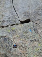 Le piogge non hanno distrutto i numerosi ometti segnaletica dell avvicinamento , abbiamo ripassato con il blu Michelin i segni che conducono alla via. Non ci si può sbagliare. Presenti anche vecchi segni arancioni . 1 L camino dove lo zaino è un po scomodo, L2 traverso delicato a sx in partenza . L3 l4 molto più soft. L5 molto bello con movimenti in dulfer . Ultimo tiro passo delicato in uscita