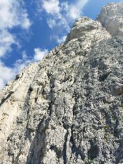 L 2: qualche metro a sinistra, poi lama diagonale sempre verso sinistra di V; (20 metri, 1 chiodo, sosta su 2 chiodi);