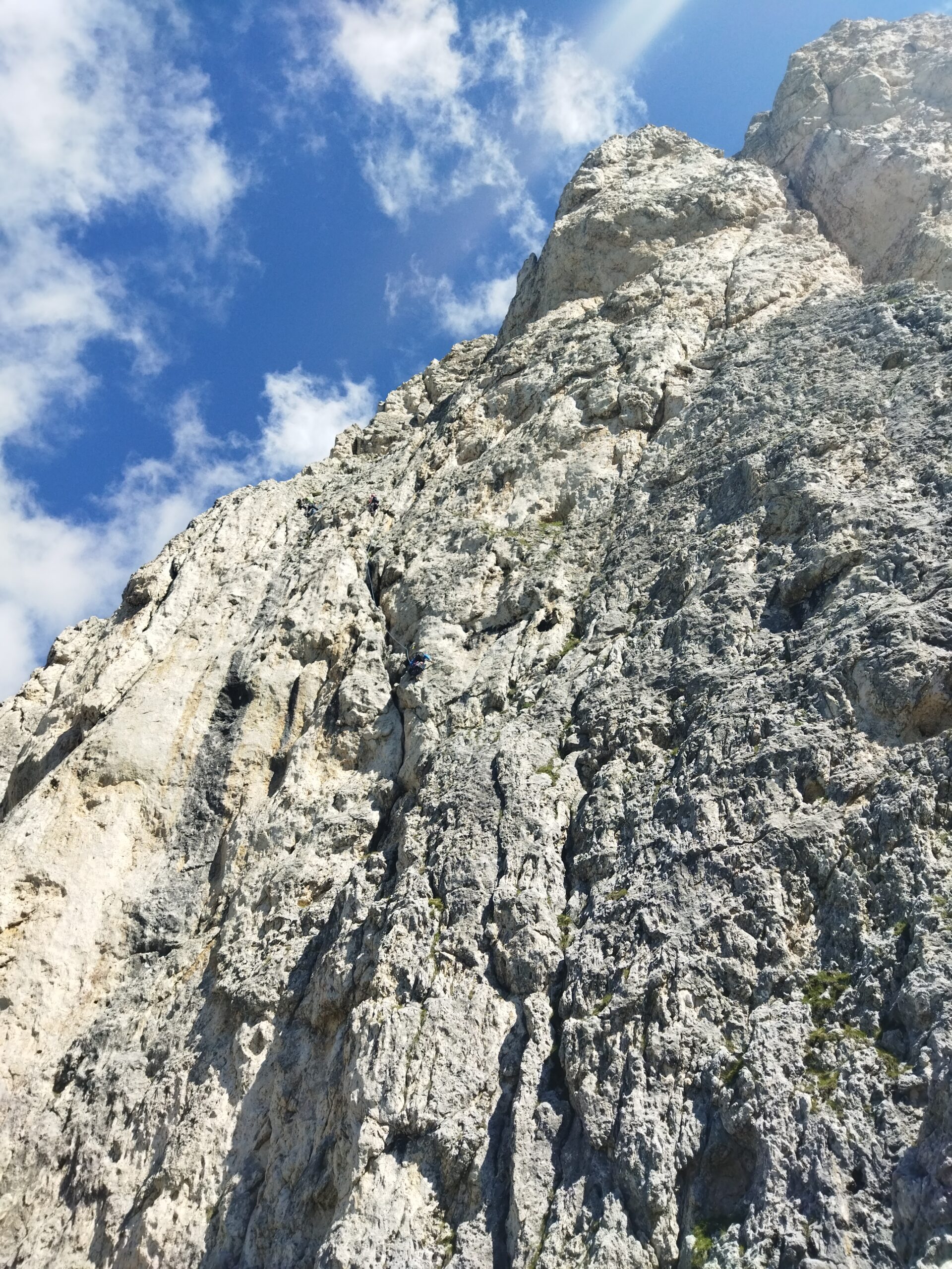 L 5: cengia camminabile con pietre e detriti; (40 metri, sosta su 2 chiodi);