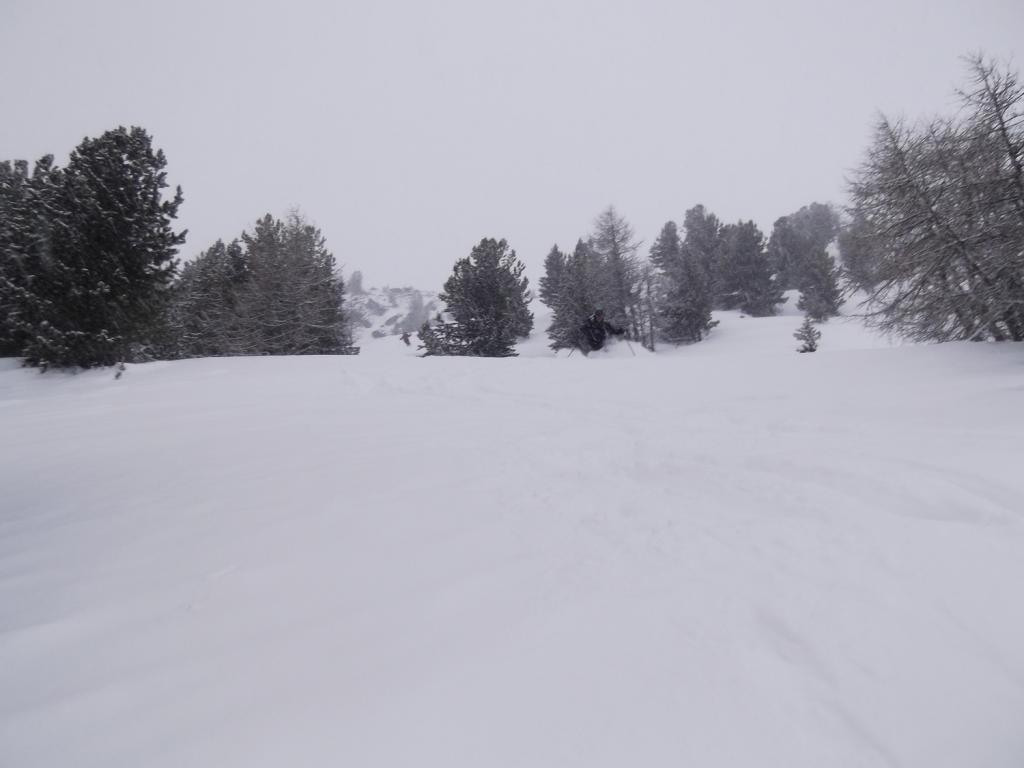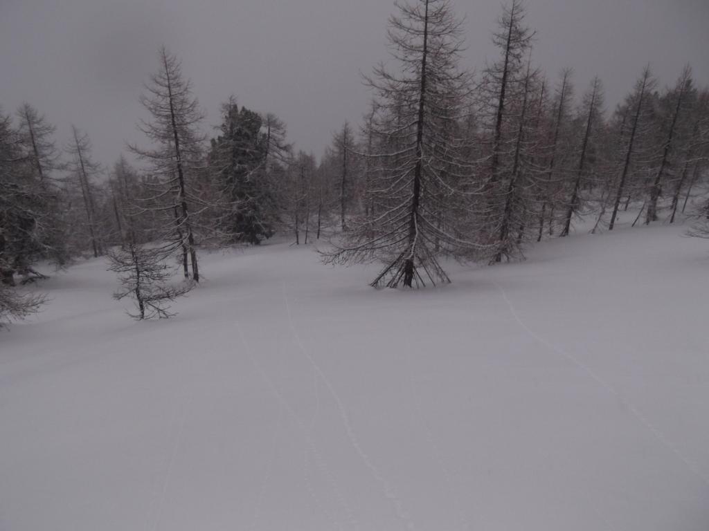 saliti per la dorsale, in alto la neve è stata spazzata via dal vento e in alcuni punti si deve fare attenzione alle pietre affioranti. Noi, dopo un breve tratto a ritroso e una volta raggiunti i primi alberi, siamo scesi sul versante est verso il vallone di Menouve trovando farina abbondante in uno splendido bosco dalle pendenze sostenute. A q. 1900 ca abbiamo seguito verso dx un evidente sentiero pianeggiante (senza ripellare, ca 1 km di lunghezza)che riporta alle baite poste proprio sopra i pratoni della parte bassa, che oggi erano in condizioni pazzesche con una spanna di neve fresca su fondo duro e liscio.