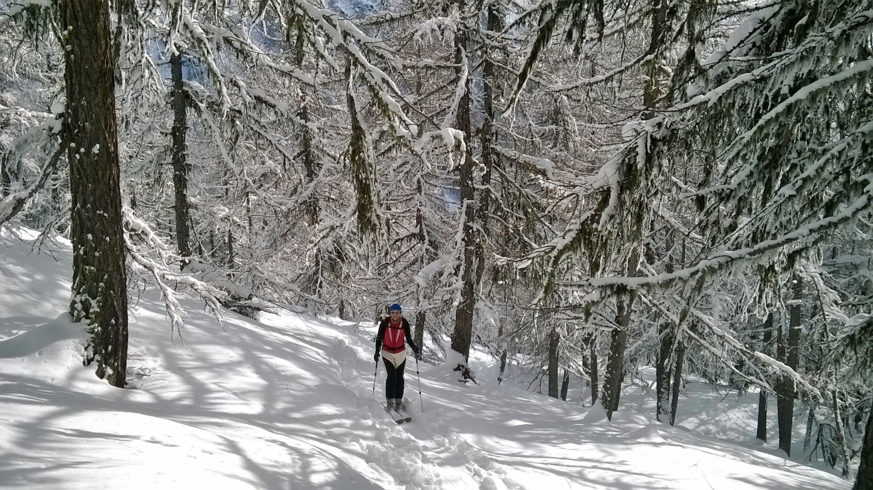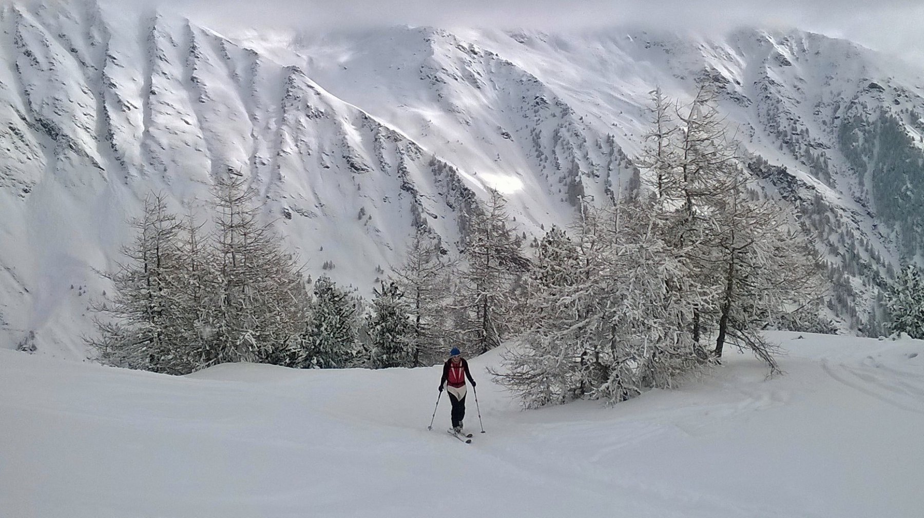 Ho messo 4 stelle alla “sciabilità”perchè la neve,dove c’è,è da 4 stelle,il problema è che come si esce dal bosco la dorsale è assolutamente impraticabile.Due dita di neve fresca sopra una pietraia senza fondo.La maggior parte di quelli che si sono avventurati verso la cima sono tornati giù con gli sci in mano.Io e Lory prudentemente ci siamo fermati proprio 100mt sopra la fine del bosco,abbiamo traversato in orizzontale e siamo scesi verso il col menouve tenendoci al centro di un canalone.Le prime curve con cautela,poi verificato che non si toccava nulla sotto…giù a tutta su neve vergine sfruttando gli ampi spazi in mezzo alla pineta(e qui ci stanno anche 5 stelle).Infine rientro sulla stradina-