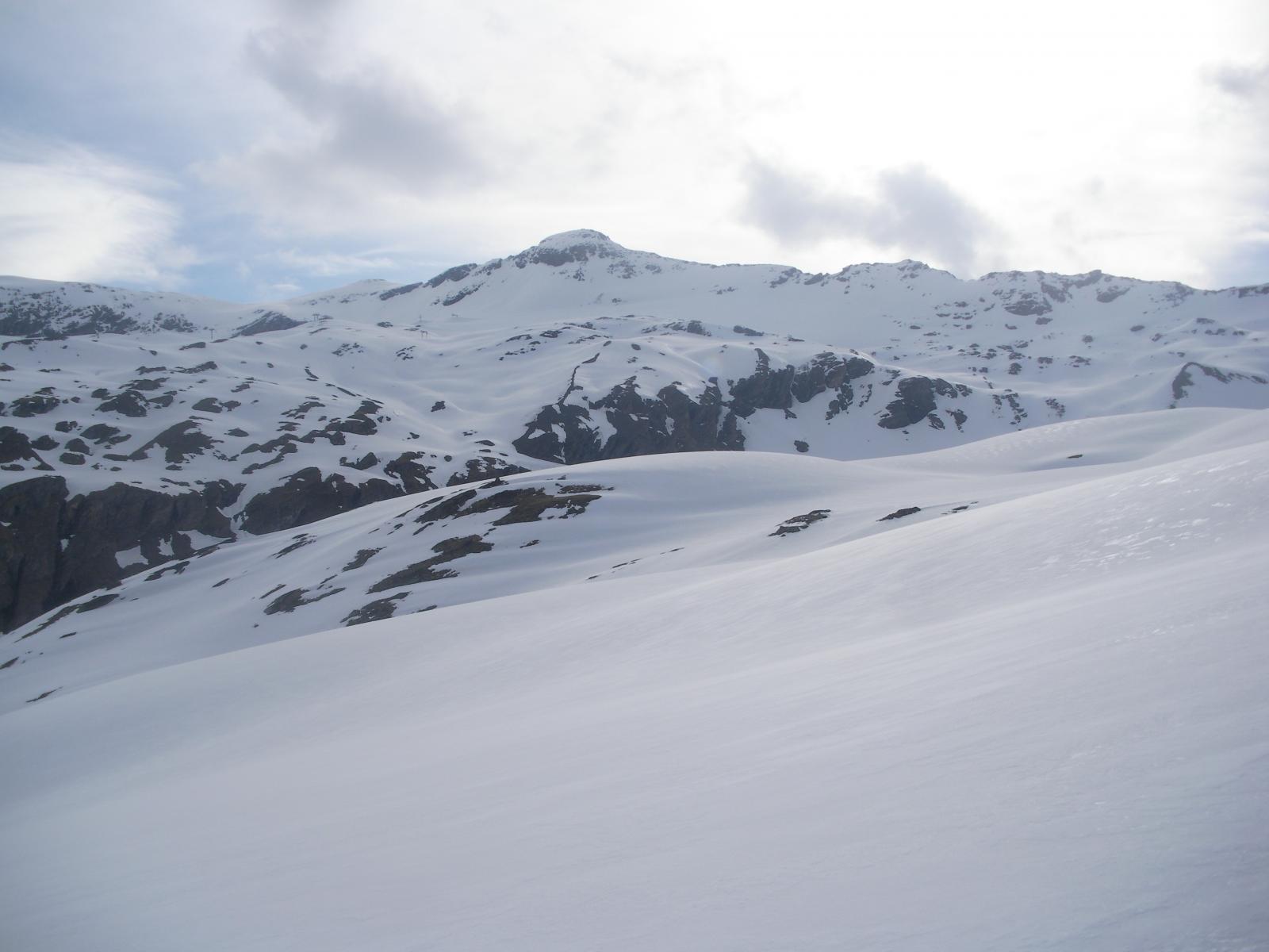 Risalire ora il ripido pendio sulla sx e raggiungere un colletto alla base della cresta sud, dove questa si impenna e dove si lasciano gli sci. Si rimonta la cresta rocciosa o di misto, superando in ultimo un breve camino/canalino di neve, e in breve si tocca la piatta vetta.