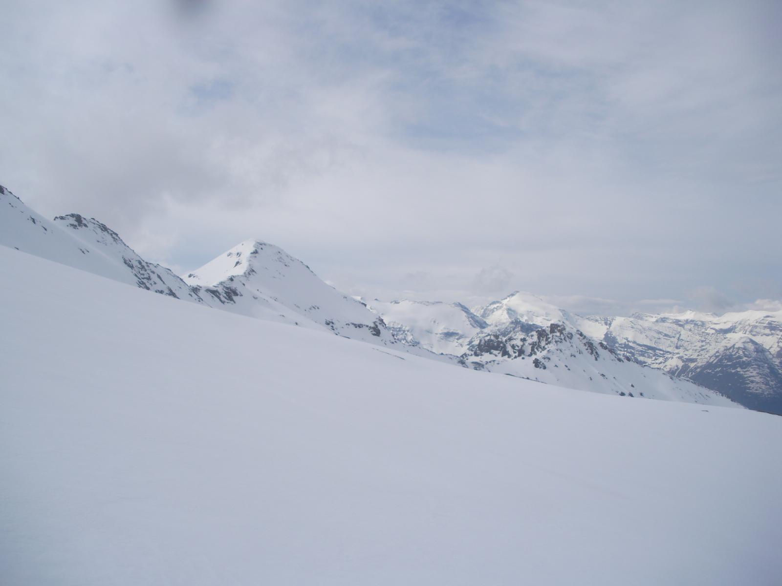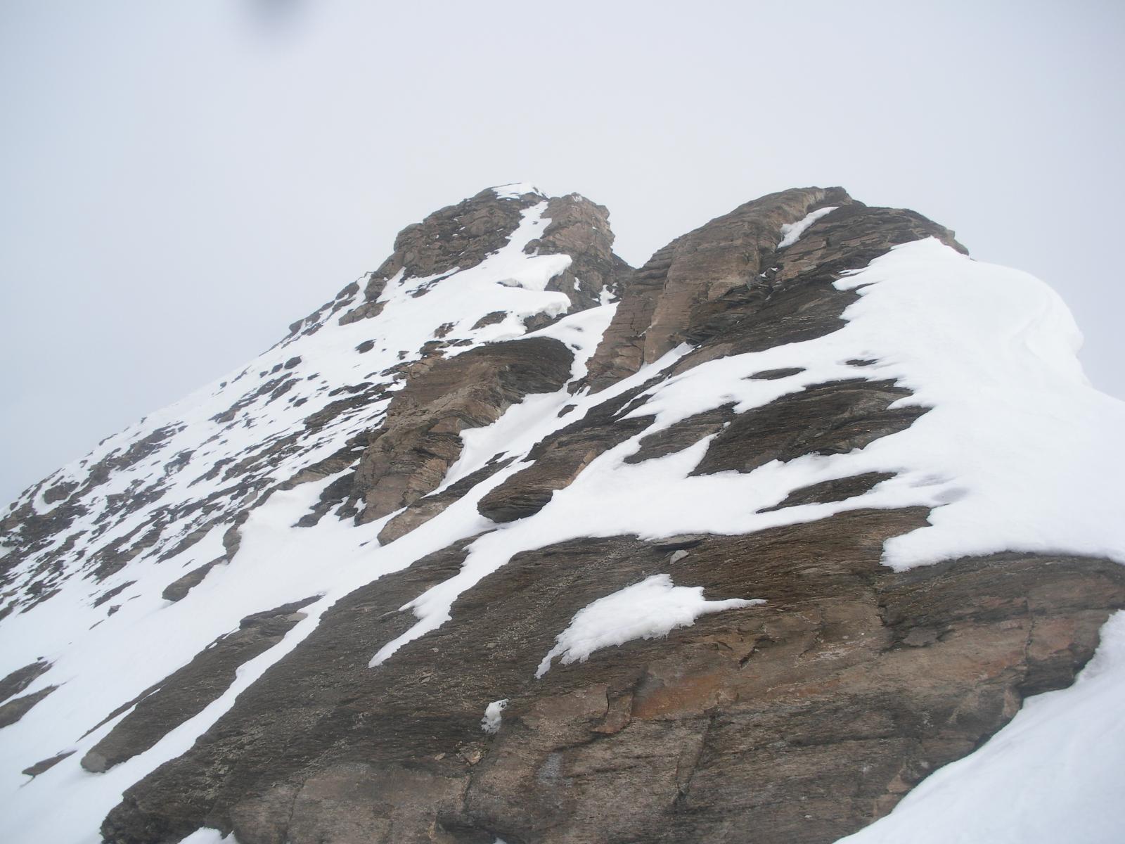 Oppure: salire fino al ghiacciaio percorrerlo in direzione est e raggiungere la terminale sotto la parete ovest, lasciare gli sci e risalire il pendio 40 ° circa 50 ° al termine, al colletto a nord della cima prendere a sud sulla cresta nord, scalare facilmente piccoli torrioni ed ecco la cima.