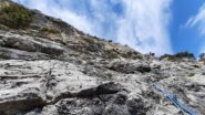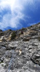 tiro di trasferimento. dalla sosta traversare a sinistra uscendo poi su facili roccette (1 spit), proseguire dritti per la Grande Cengia fino alla comoda sosta. 20m