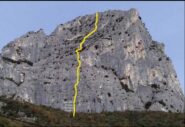 Prima su per placca appoggiata, poi vincere il tetto con passi atletici seguendo verso sinistra la grande lama gialla. sosta su terrazzino pochi metri dopo l’uscita dal tetto. 25m