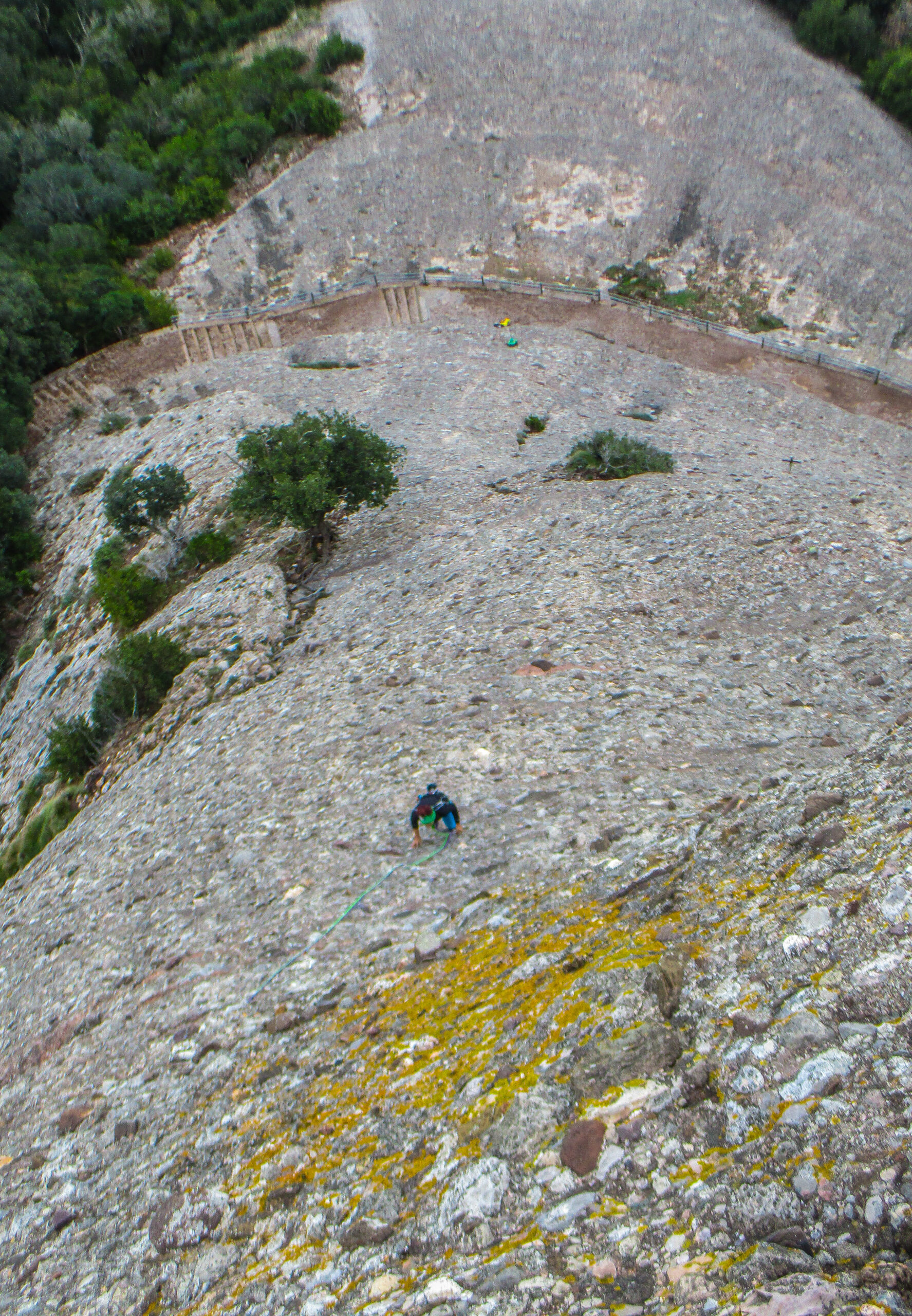 Dalla cima si va a sud cercando una calata su fix e anelli. Con tre doppie si raggiunge il canale fra gli alberi che riporta sul sentiero a pochi metri dall’attacco.