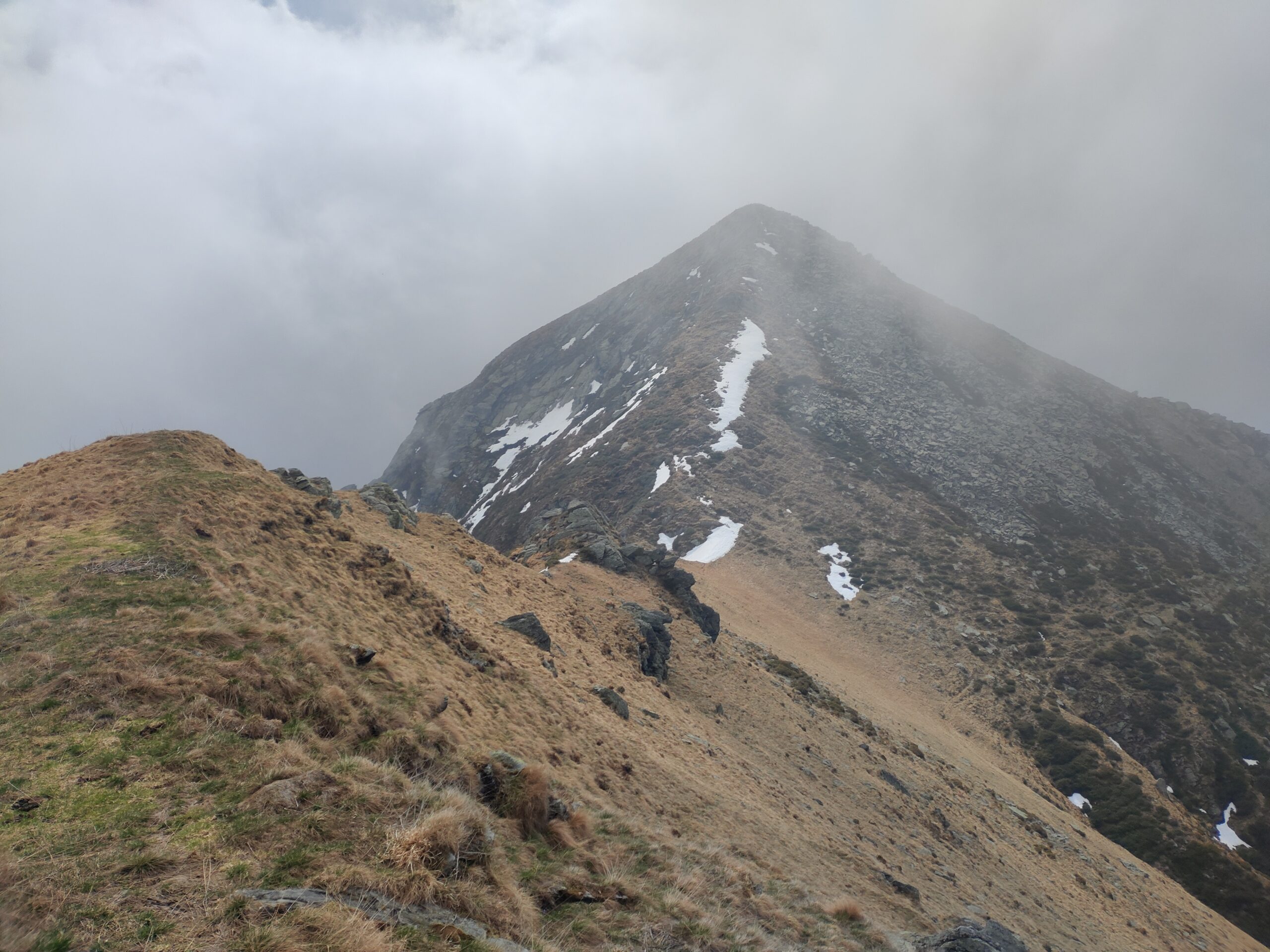 Ad oggi, prima della cima è rimasto solo un nevaio obbligato sul pendio erboso sotto la quota 2191 (carta Fraternali): si può superarlo in pochi passi ma richiede un po’ di cautela data l’esposizione. Come già segnalato da Andrea81 il 24 aprile, ricordiamo di fare attenzione, aggirando i primi dossi dopo il Veilet, al punto in cui la traccia è sovrastata da rocce pericolanti per una frana recente. A nostro avviso, nel complesso un itinerario da classificarsi EE piuttosto che E.