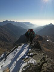 Partiti venerdì e arrivati al bivacco revelli ormai al buio in 3 e 15. Coperte a volonta’ quindi si dorme al calduccio. Al mattino si perde un po di quota e poi si sale al colle della valletta dove inizia la cresta, volendo si può aggirare in diversi punti all’inizio ma se si sta sul filo di cresta bisogna fare 2 piccole doppie e si disarrampica qualche volta. In certi punti è anche bella esposta. Poi i 2 tiri finali sono tosti specialmente oggi che che c’era ghiaccio e neve ad amplificare il tutto. Scesi dalla cresta nord piena di neve (quindi ramponi obbligatori) e dal colle di forzo con 3 calate giù per il canale, e poi un lungo rientro all’auto…. ( bella li)