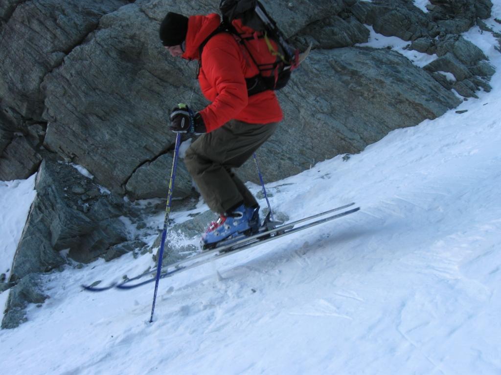 Sino a qui valutazione proposta 4.2 E2 oltre tale punto, Mario Monaco che lo ha percorso qualche tempo dopo e quasi integralmente, propone un 5.1 E2. Chi affronta questo itinerario deve tenere presente e dell’ambiente cupo e dello spazio relativamente stretto per curvare che possono “dare fastidio” nella discesa e pertanto non è da sottovalutare benchè la quotazione non sia particolarmente elevata. Inoltre va detto che il canale riceve di tutto e di più dal ghiacciaio pensile(neve e pietre o tutto insieme), ma anche dalla parte sovrastante allo stesso. In breve il Viso non è mai banale anche nelle discese più “semplici”
