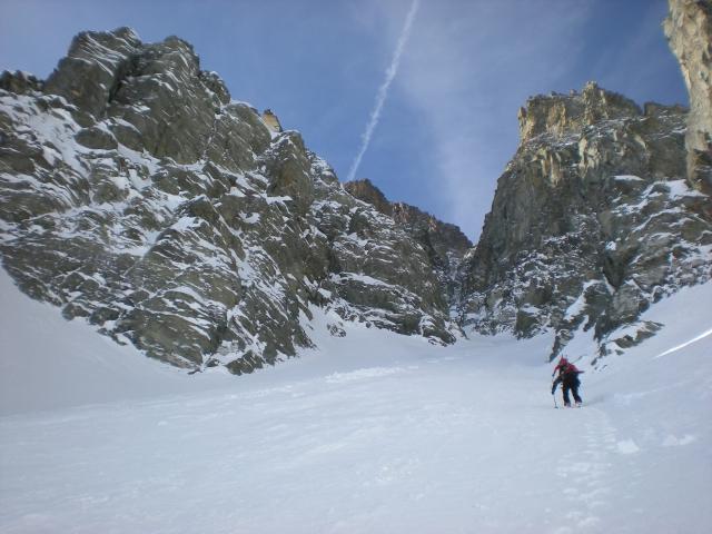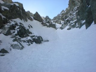 Bel canale con farina compressa e temperature abbastanza fredde che hanno garantito buona stabilità al manto nevoso. Dal canale scendeva continuamente un sottile strato di neve leggera probabilmente proveniente dal sovrastante nevaio. Ambiente molto severo e bello. Fermati a quota 3050 dove poi inizia un tratto di misto. In compagnia di alex e del king.