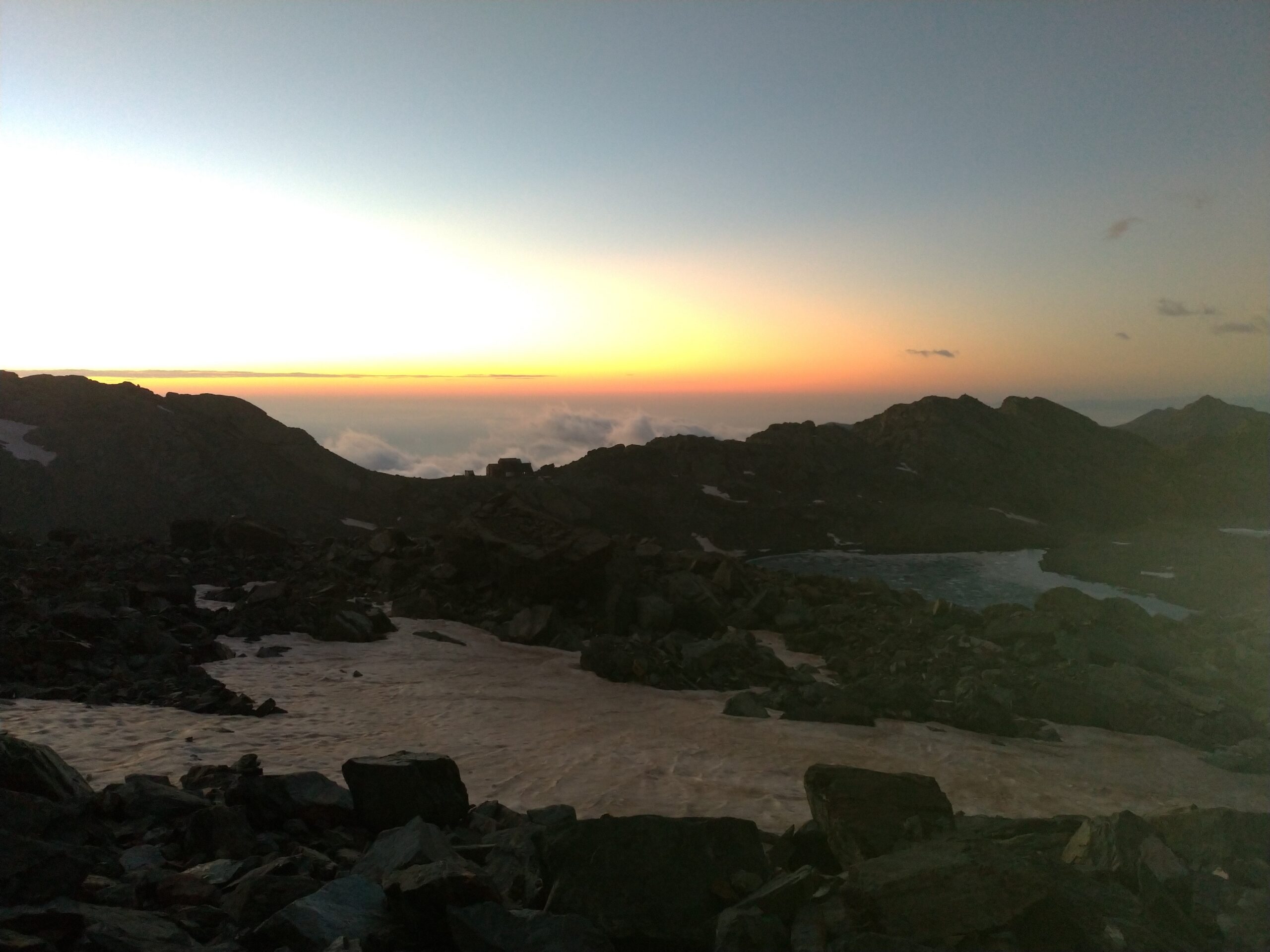 Ritorno estenuante: condizioni via normale accettabili ma non ottime, tanto ghiaccio affiorante e neve di pessima qualità. Sotto i 3500 circa la via della normale è libera da neve ad eccezione dei bacini sopra e sotto il bivacco Andreotti.