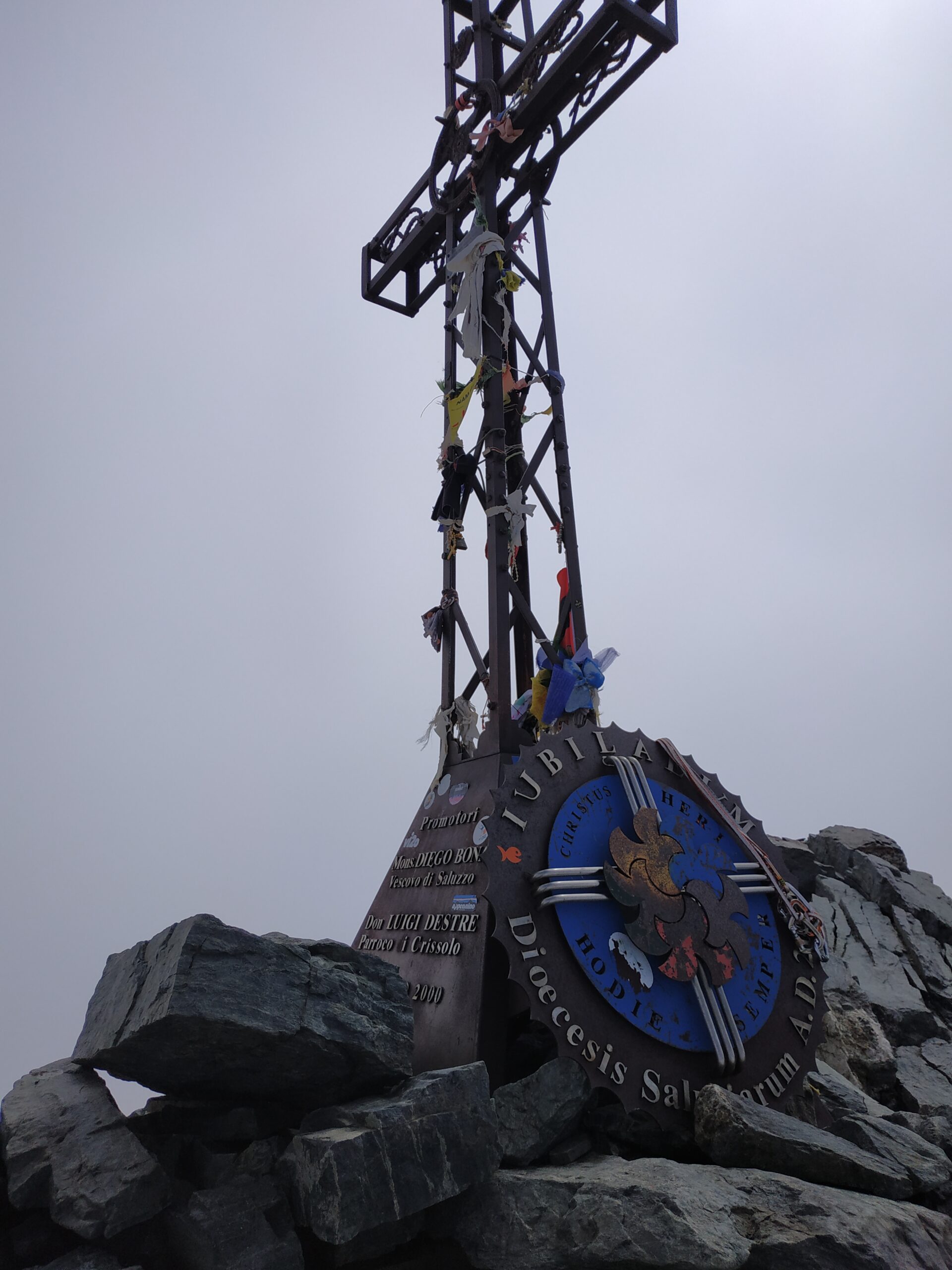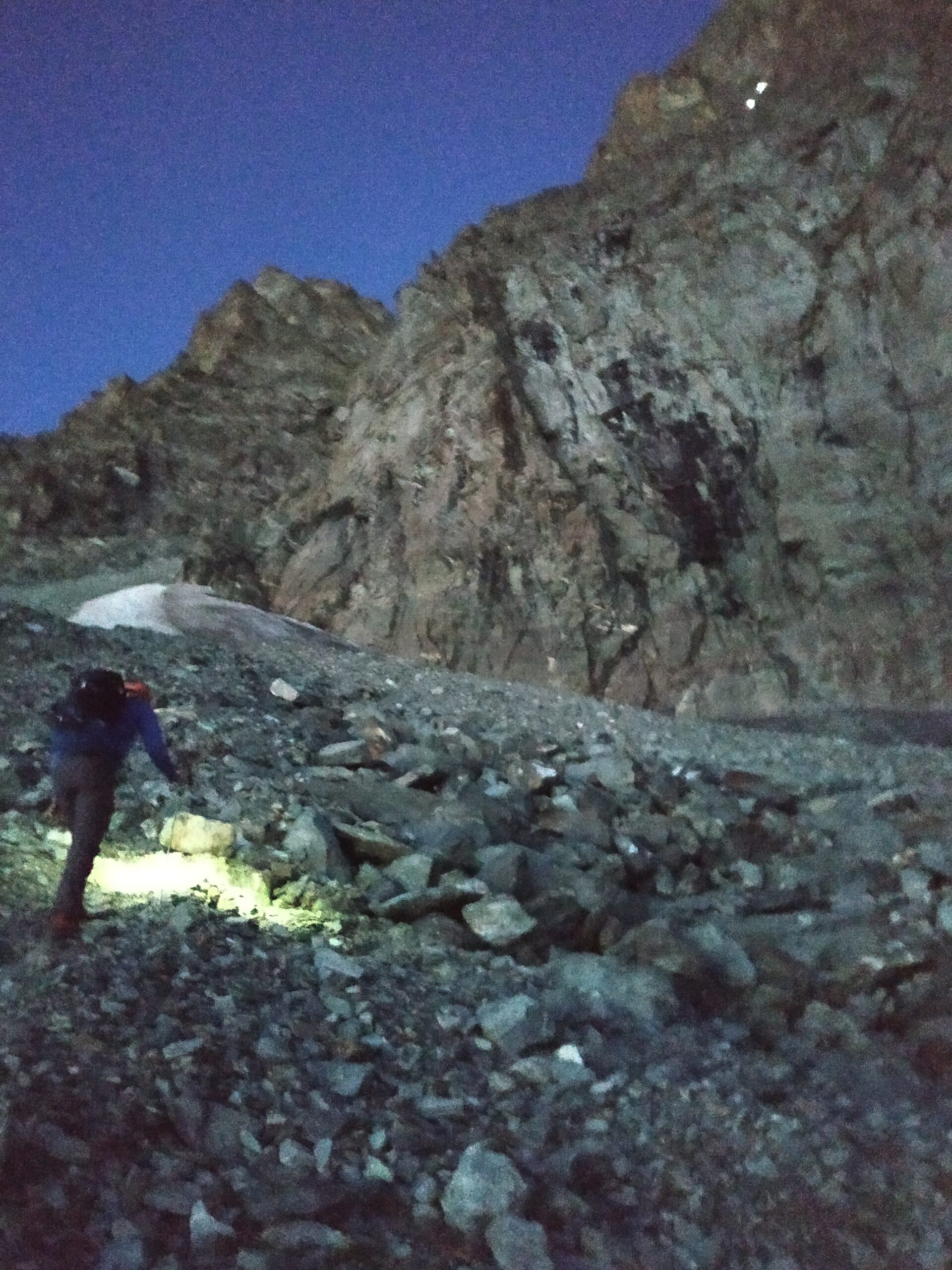 Saliti dal Pian della Regina e dormito in tenda (Rifugio pieno). Sveglia alle 4, colazione e via, avvicinamento all’attacco con pile frontali, il canale di accesso presenta una lingua di neve ghiacciata che si attraversa in alto senza bisogno di ramponi nei pressi dell’attacco della Via (segnalato da un bastoncino piantato). Sullo sviluppo vale recensione precedente sia per la salita (anche noi abbiamo aggirato il Torrione S. Robert), sia per la discesa sulla Normale.