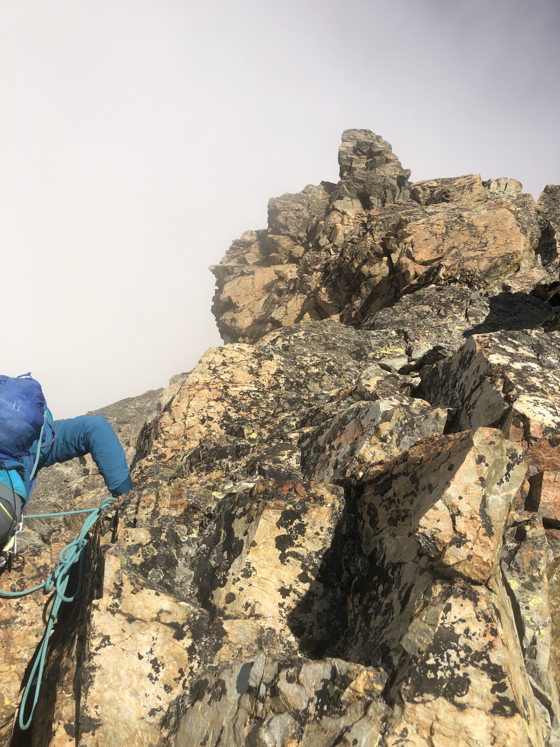 conoide l’accesso è più complesso e infido. Occorre salire sulla roccia prima e a destra del punto precedente. Occorre essere molto delicati per non far cadere sassi. Fatti tutti i torrioni. Arrivato in vetta con una certa folla salita dalla normale che abbiamo disceso. Non c’è neve ne ghiaccio.
