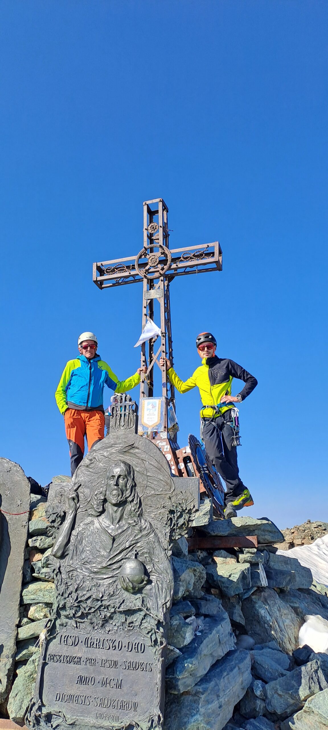 Ormai è un rito come tutti gli anni un saluto al re bisogna farlo. Ramponi utili nel conoide d’attacco ma noi non li abbiamo usati dato che durante la notte non ha rigelato. Con Piero sempre in ottima forma.