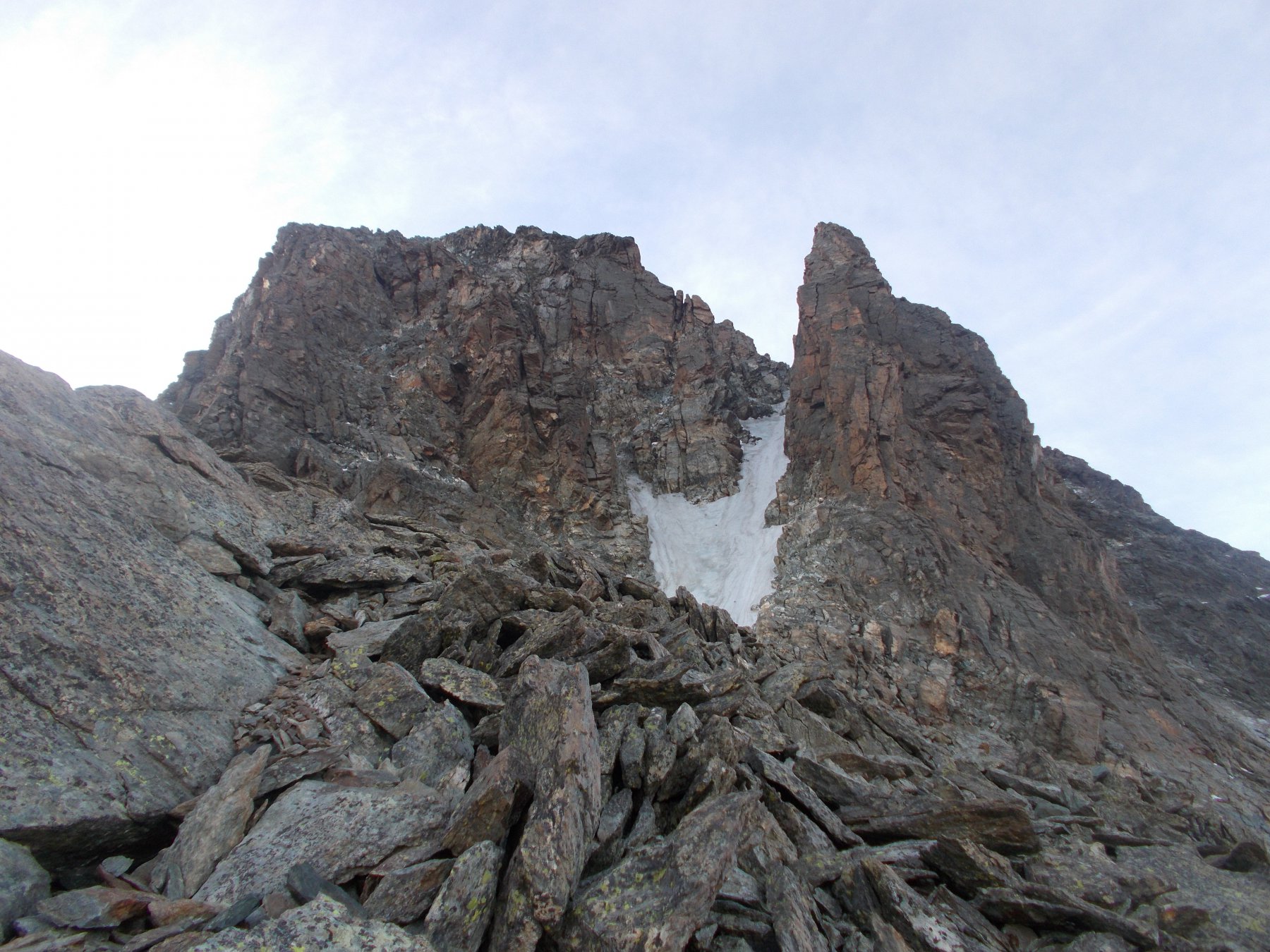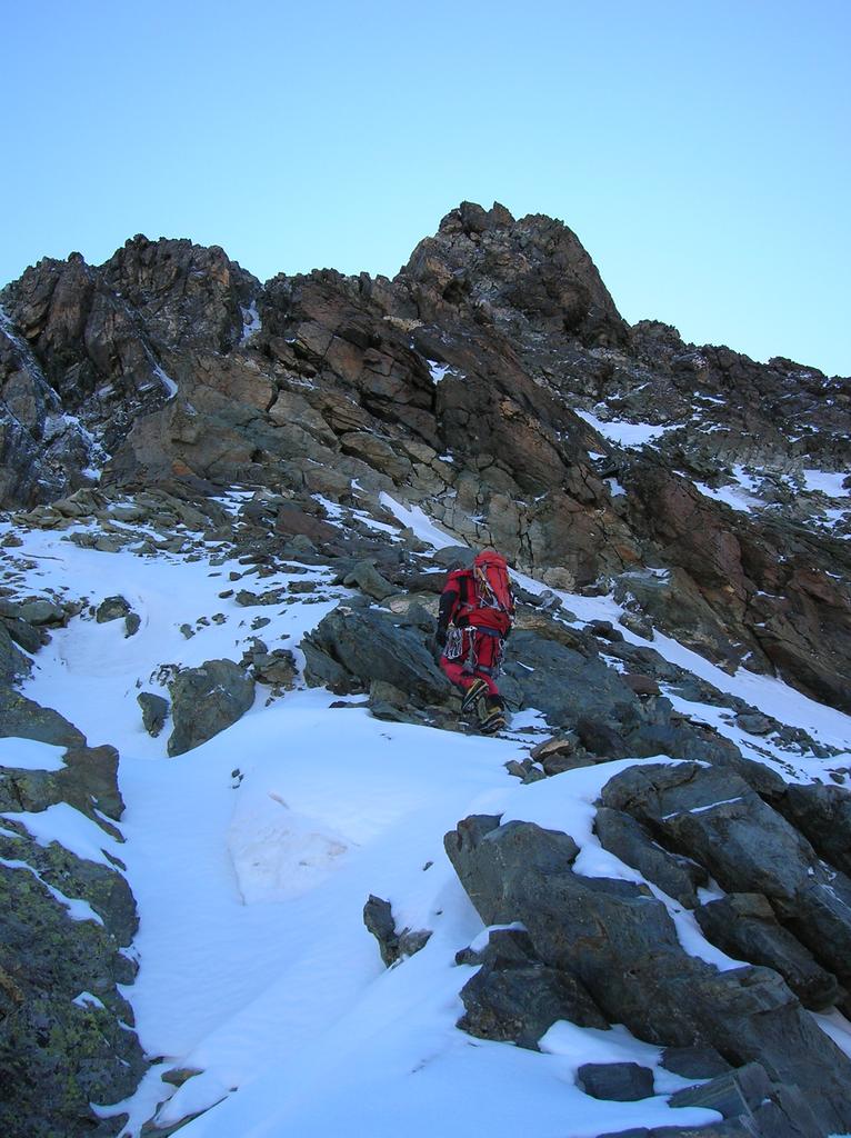 Dal colle salire per facili rocce ad un colletto poco marcato obliquando verso destra.salire l’ampia cresta verso il primo torrione su cui si intravede una sosta. Risalire il torrione , proseguire sulla cresta e salire il 2° torrione. Proseguire su sfasciumi fino alla cresta che delimita la parete ovest dalla parete nord. Proseguire verso destra restando a ovest su roccia buona e guadagnare la vetta su sfasciumi.