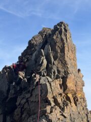 Cresta bellissima inizio semplice su sfasciumi, due torrioni con bella arrampicata, altri sfasciumi.