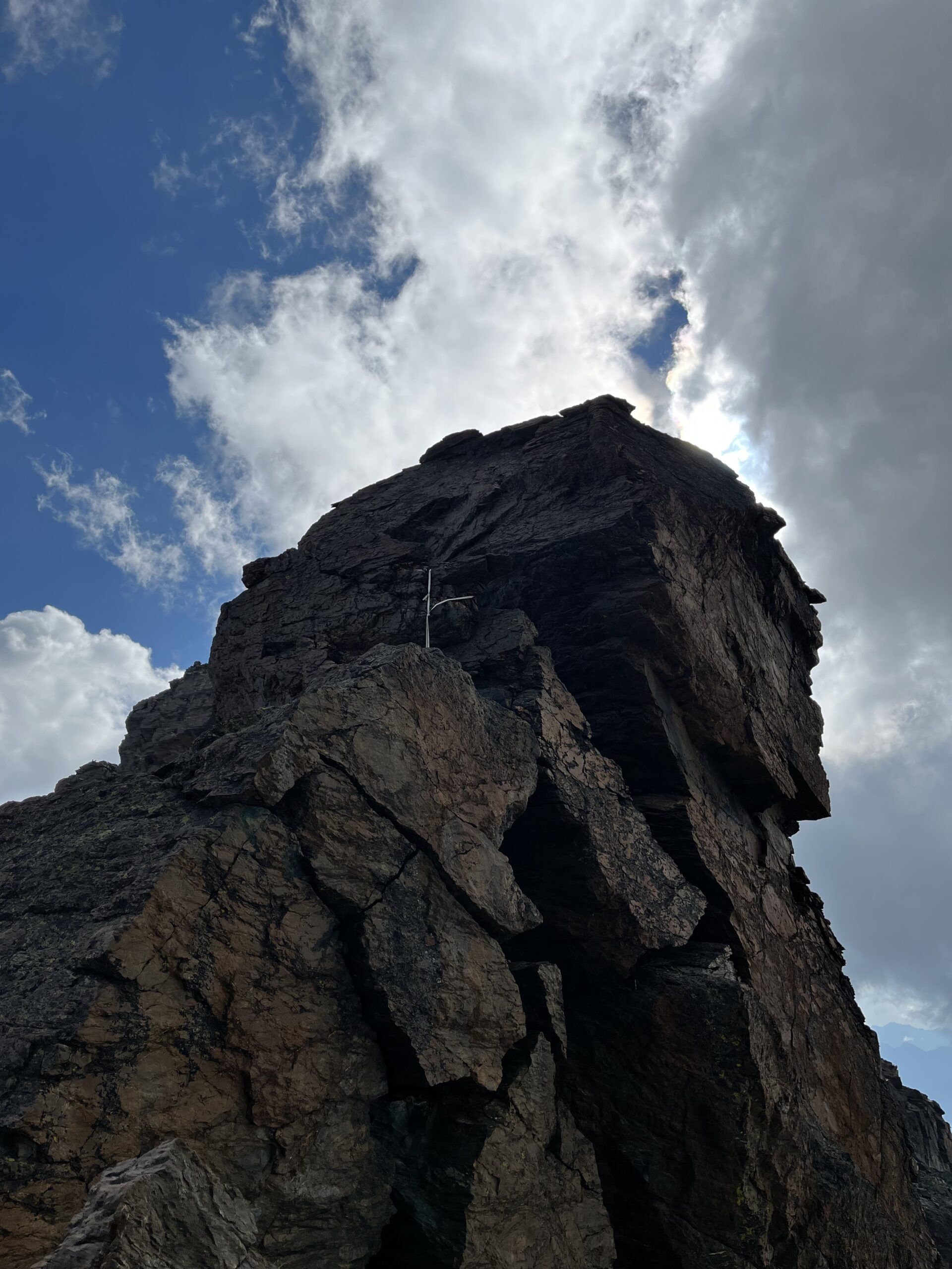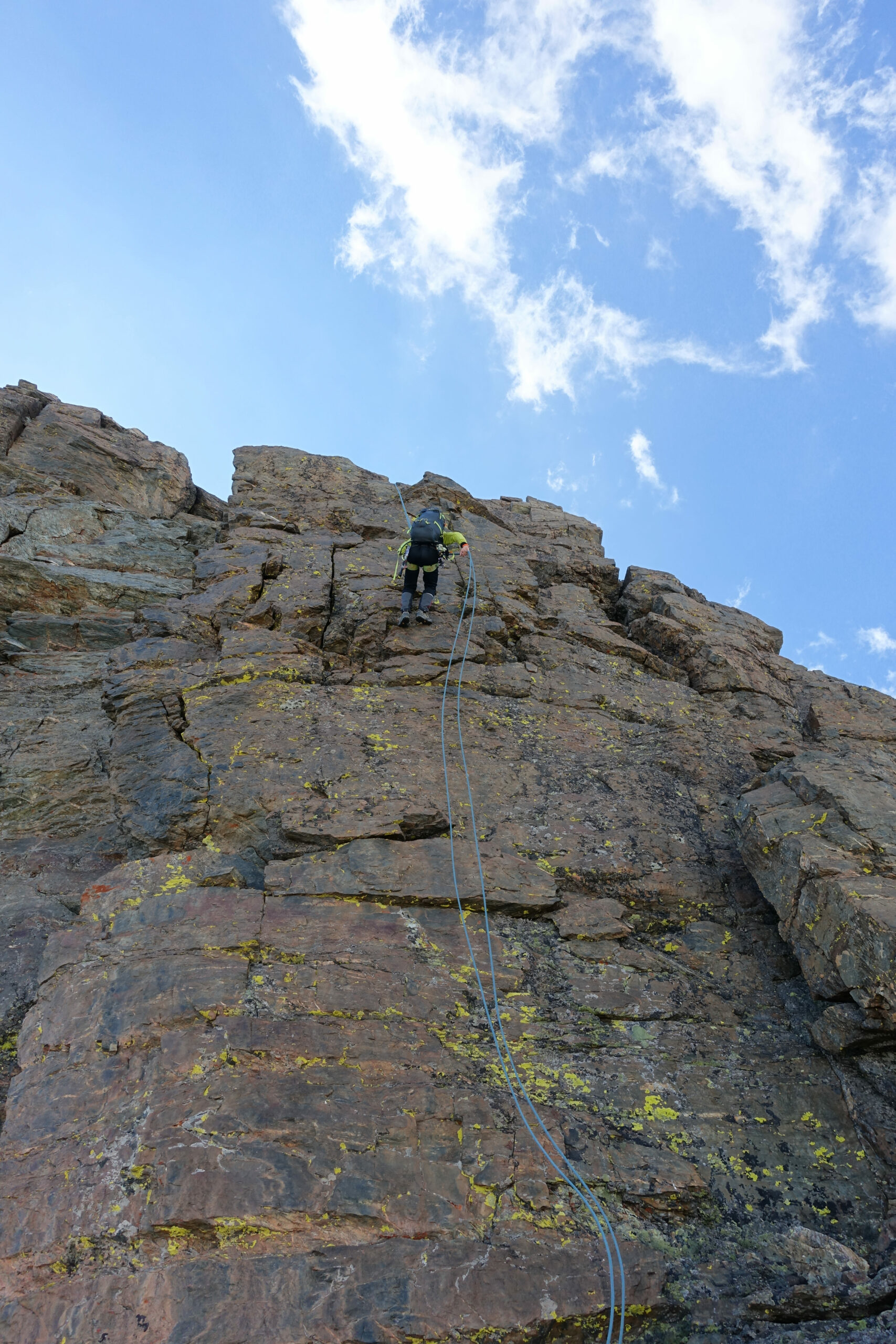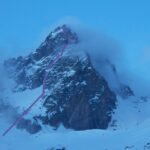 Scendere dallo spigolo rivolto a nord, arrivare sulla forcella, salire un breve camino(verglas, occhio) e salire lo spigolo che in breve porta sul Torrione Orientale Sari. Scendere facilmente all’intaglio del passo Perotti(3760mt).