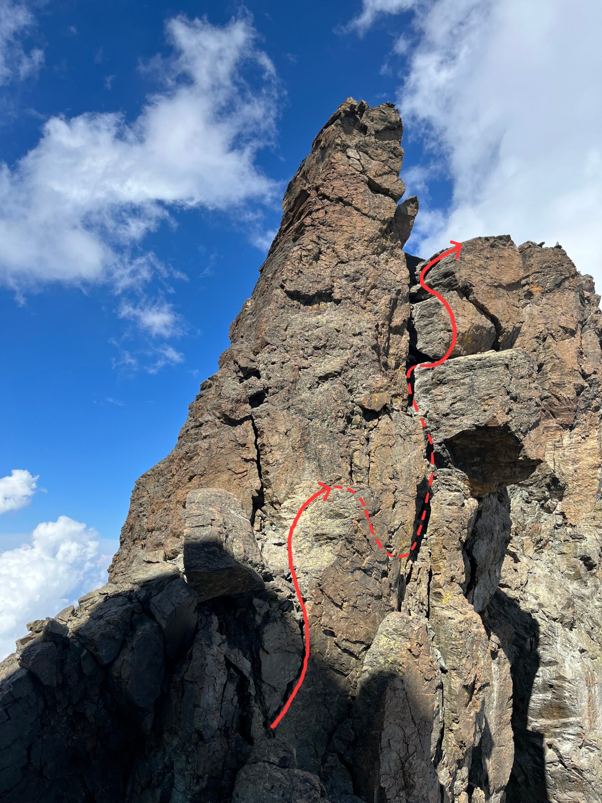 Salire lungo lo spigolo a destra del camino e rientrare nel camino al suo termine ed arrivare sulla sommità del Torrione Occidentale. Scendere disarrampicando il facile spigolo est, poi raggiungere il colletto che lo separa dal torrione centrale(occhio al verglas) Dal colletto seguire una stretta cengia a destra(expo) fino a un canalino tramite il quale si raggiunge il Torrione Centrale Sari.