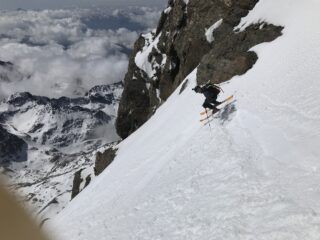 Stando salendo in tre dietro di noi e fa caldo, per cui via per il canale tra le due punte. SLURP. Saltino ghiacciato alla base riramponato e picozzato (allorchè mingollato diranno alcuni) e già che li avevamo addosso tenuti fino a sotto i fornelli (ma non brucia).