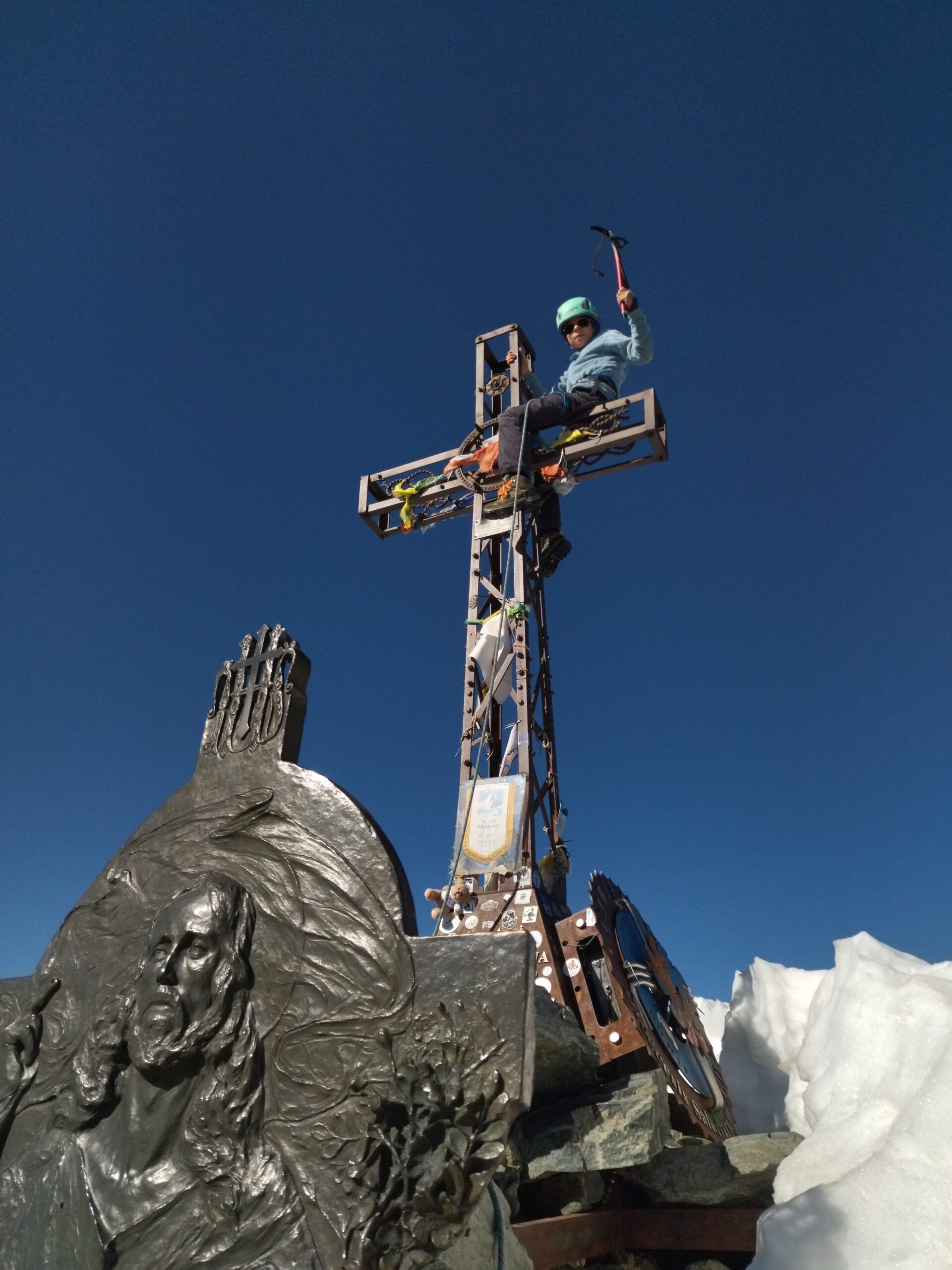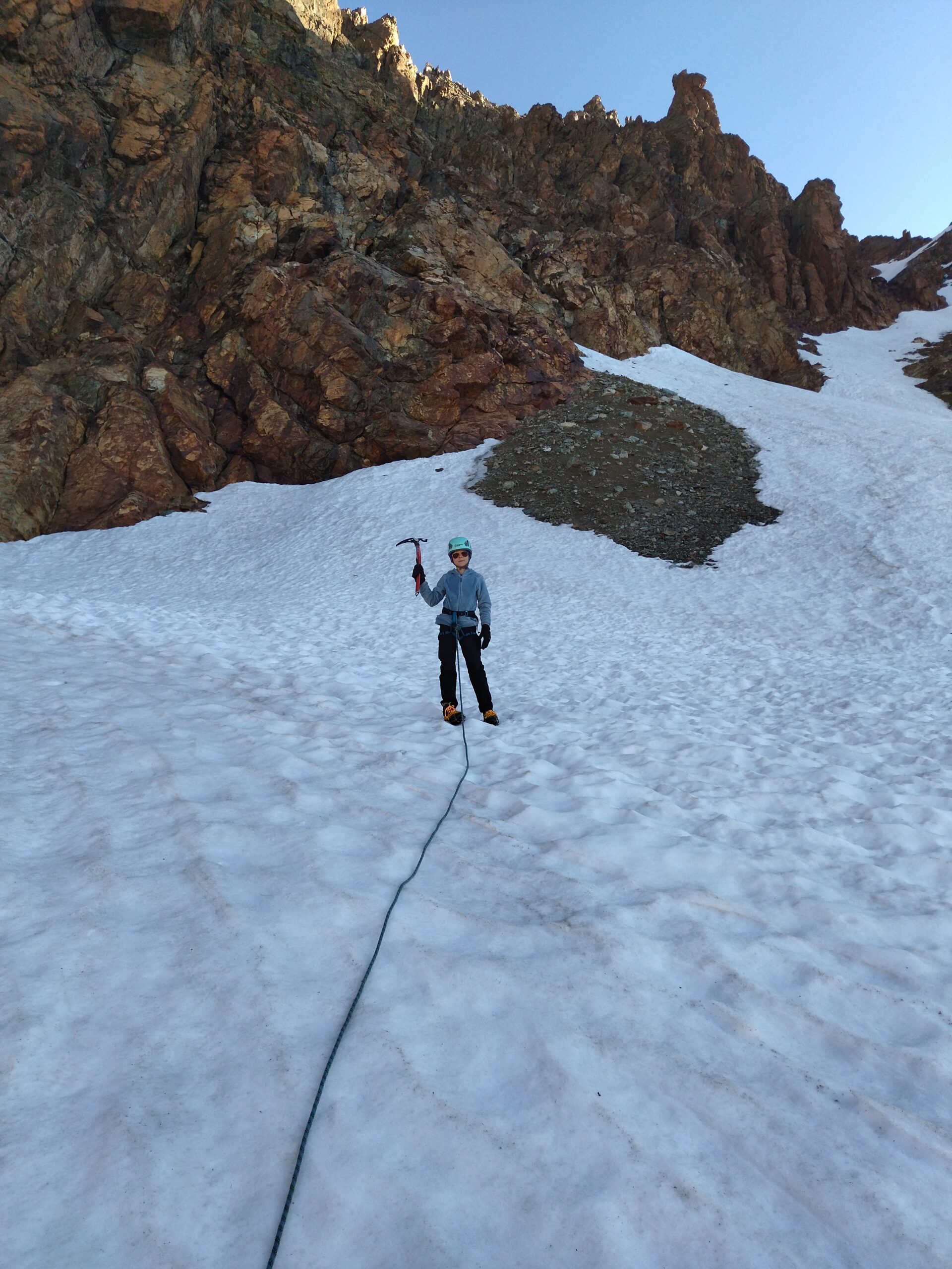 Partenza dal bivacco alle 5,30 con piena luce, si inizia a pestare neve dal pianoro sotto l’Andreotti. Tenuto i ramponi fino in cima, per tranquillità e sicurezza a tenere mio figlio, comodi sui 4-5 tratti di neve che si trovano ancora sopra il nevaio Sella, una bella esercitazione di dry tooling per i molti tratti su roccia…