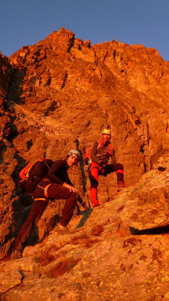 Man mano che si sale si trova una velocità ottimale, numerosi tratti facili affrontati senza corda, intervallati da saltini più difficili dove ci si protegge, ci portano al torrione Saint Robert, punto in cui si divide l’itinerario. Noi gravati dal peso dello zaino optiamo per l’aggiramento, quasi tutti lo scalano direttamente. Poco dopo sulla cresta si trova un po’ di neve-misto sul versante all’ombra, non ci facciamo mancare niente! Oramai la lunghezza della via comincia a farsi sentire, felici incontriamo la via normale che sale dal lato Sud, per la quale arriviamo in vetta.