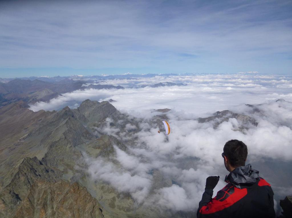 Mi ritrovo subito catapultato sul versante Nord con questa strana visione della parete, la vela va perfettamente, le nuvole in lontananza, il Quintino sotto i piedi, il Giacoletti più distante… Mi giro e vedo il Re di Pietra con tanti minuscoli puntini sulla vetta, povera Mara non la invidio proprio, la discesa a piedi è lunghissima, almeno è in buona compagnia con gli amici della vetta.