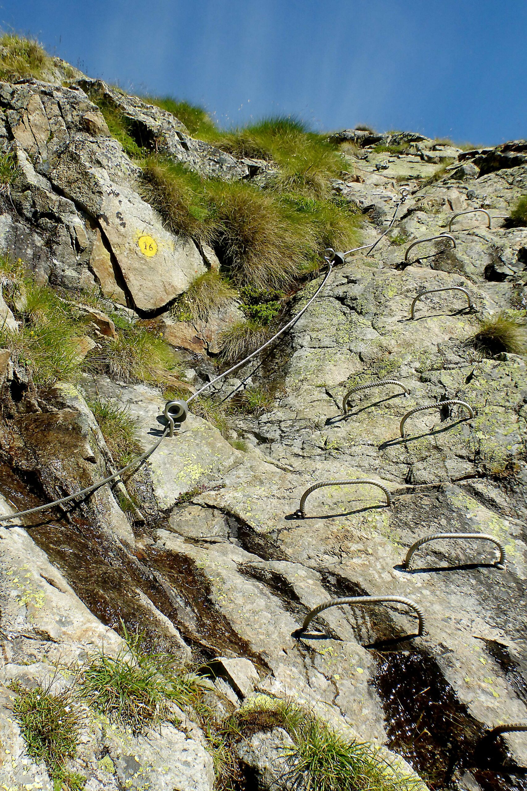 Ferrata con catene nuove e luccicanti, molti punti di ancoraggio. Rifugio aperto e ambiente splendido