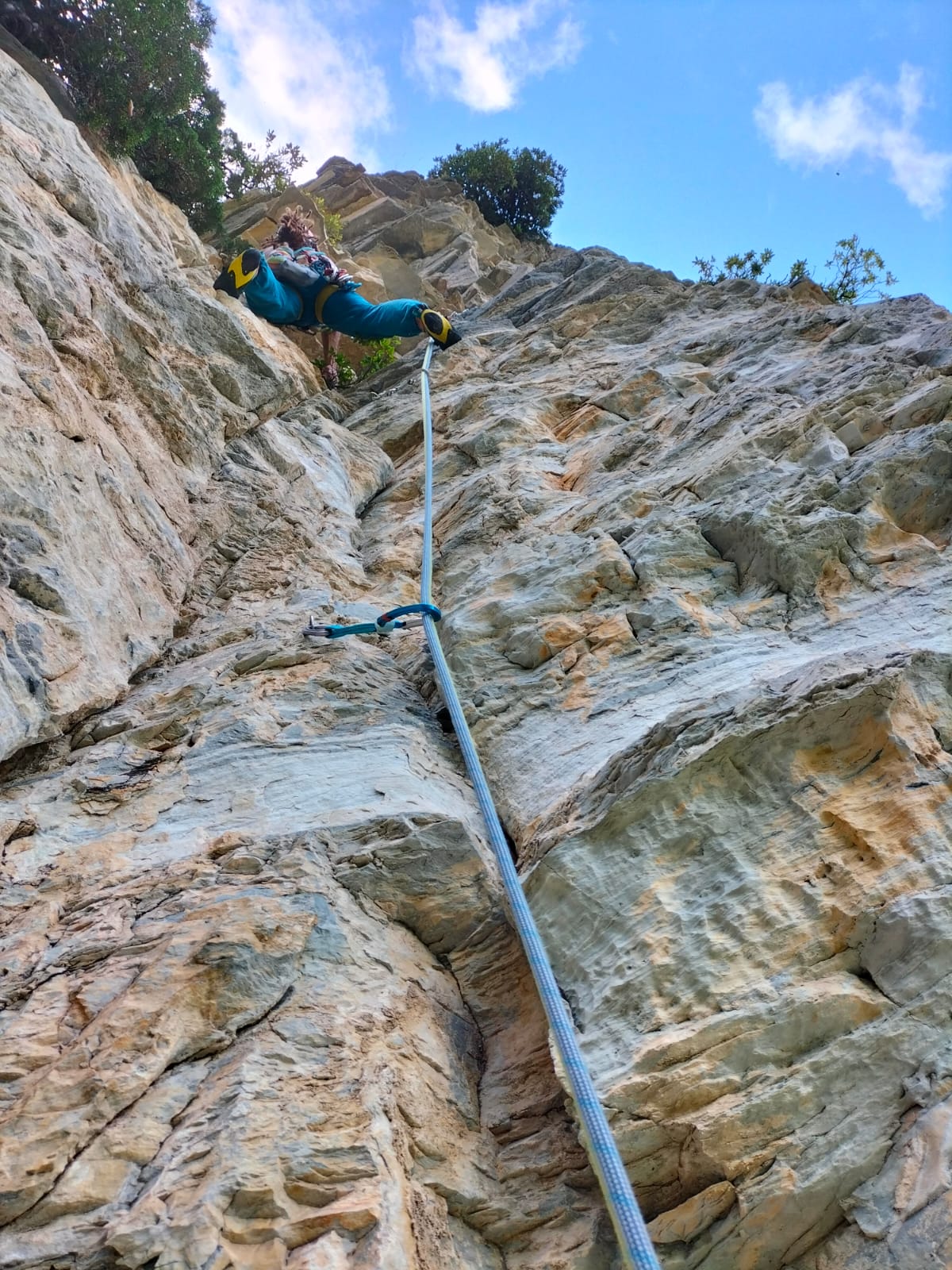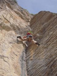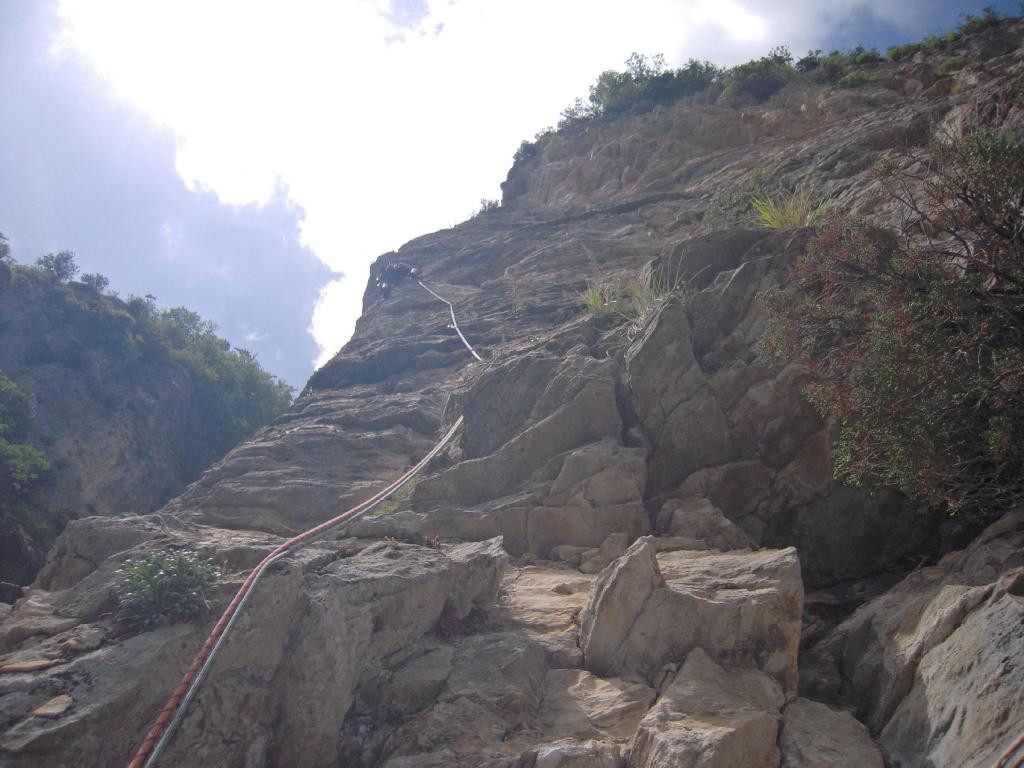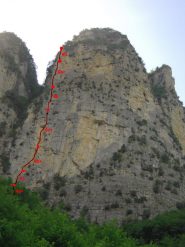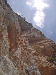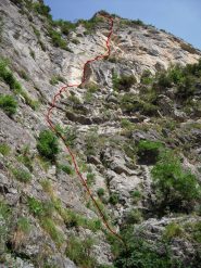 Per tracce di sentiero si entra nel bosco e dopo circa 50 mt prendere la traccia di destra che dopo circa trenta metri inizia a salire il ripido bosco sino alla base della parete (30 min.).