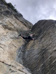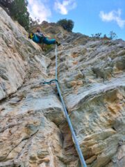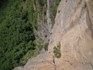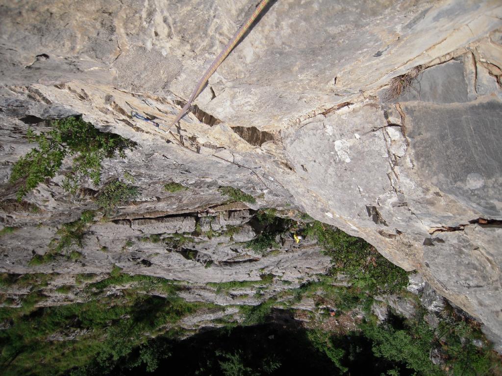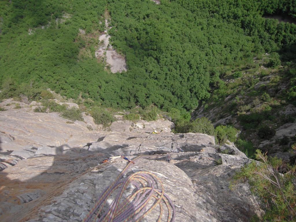 Discesa in doppia con alcune calate attrezzate fuori via. conviene moschettare alcuni fix sopra al tetto e il cordone sotto al tetto. La calata successiva è in netto obliquo verso sx, anche qui moschettare alcuni fix. Sufficienti corde da 50 m, probabilmente se non si saltano le soste è possibile scendere anche con la corda singola.
