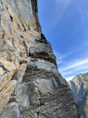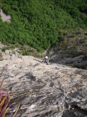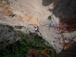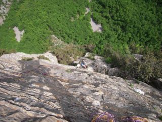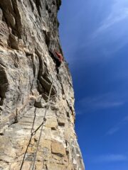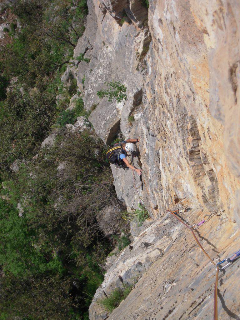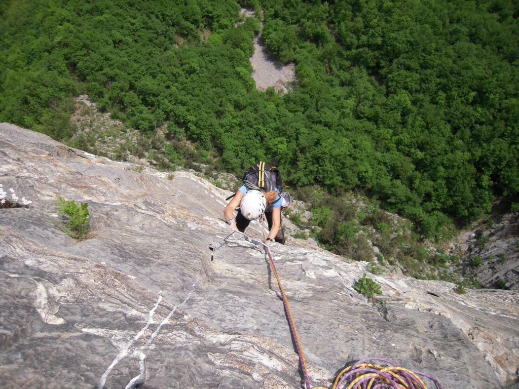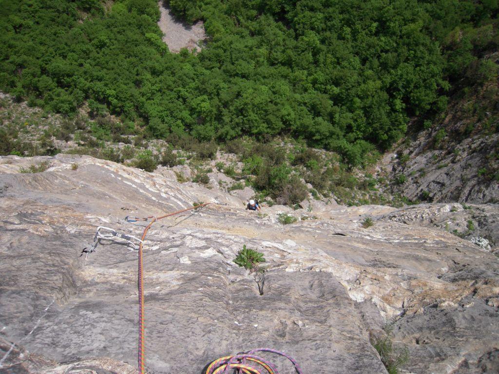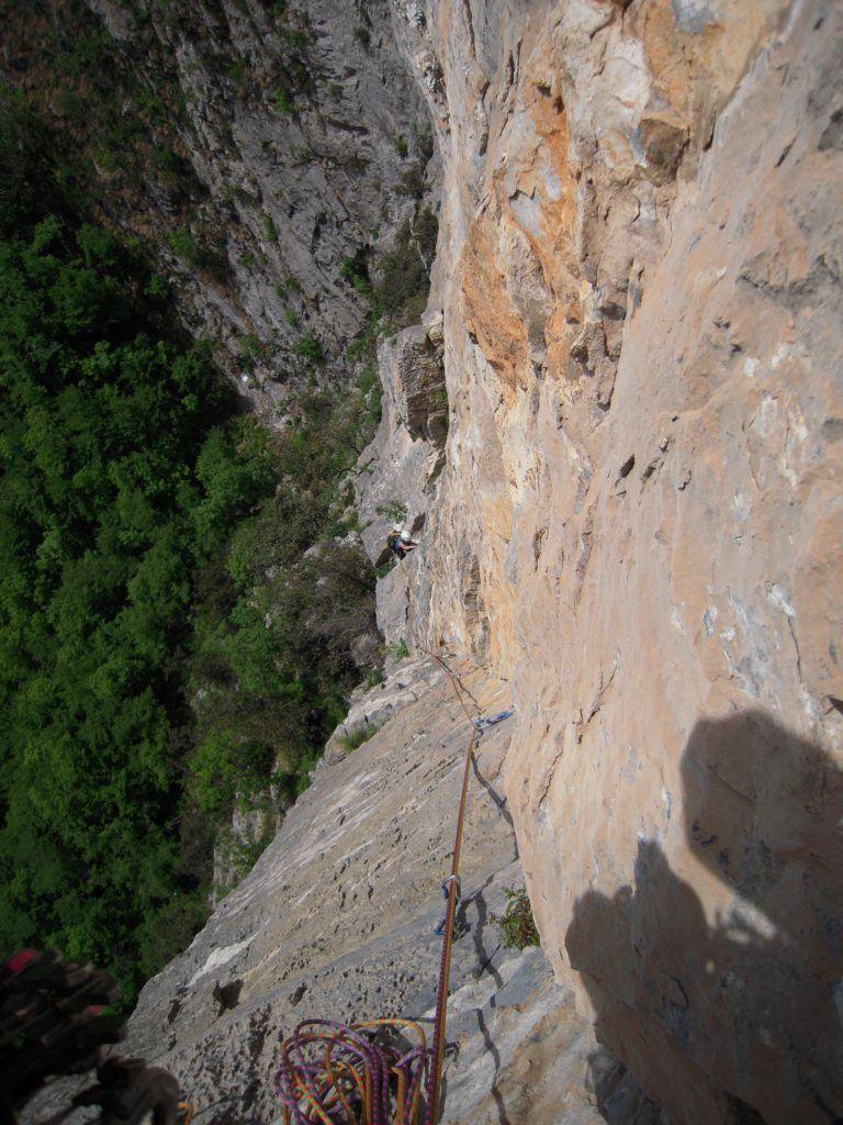 Via da non sottovalutare con chiodatura distanziata sui tiri facili, ma ben integrabile con protezioni veloci, ravvicinata su quelli impegnativi.