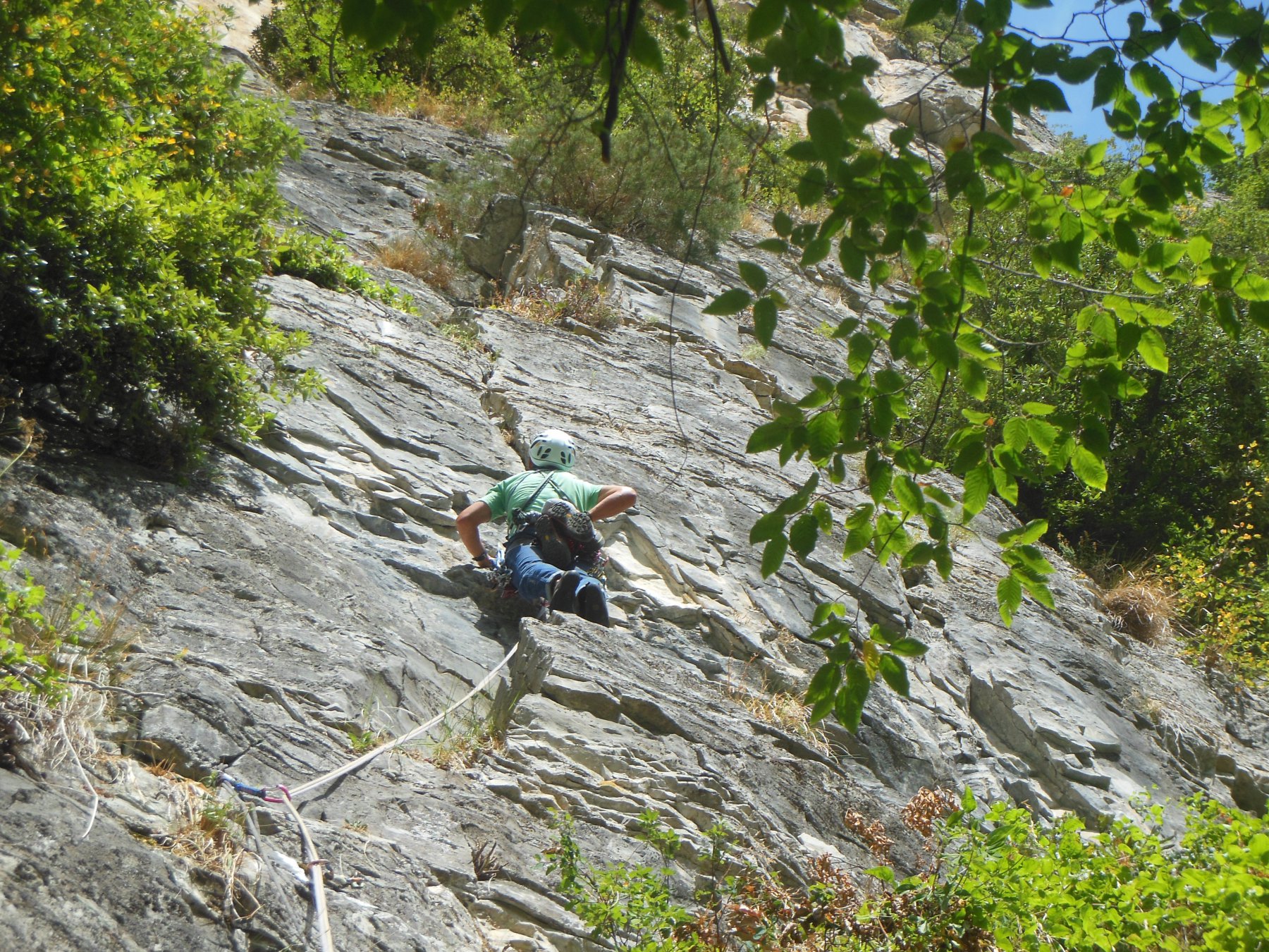L5 partenza sprotetta e non facilmente proteggibile dalla sosta (roccia ottima ma prestare molta attenzione) e poi lungo muro a tacche con chiodatura a tratti distanziata. Prima di un run-out si incontra uno spit con maglia rapida, lo spit successivo non si vede subito perchè coperto, ma c’è (e non troppo lontano). Possibilità di integrare facilmente. 6b (personalmente non negherei un +)
