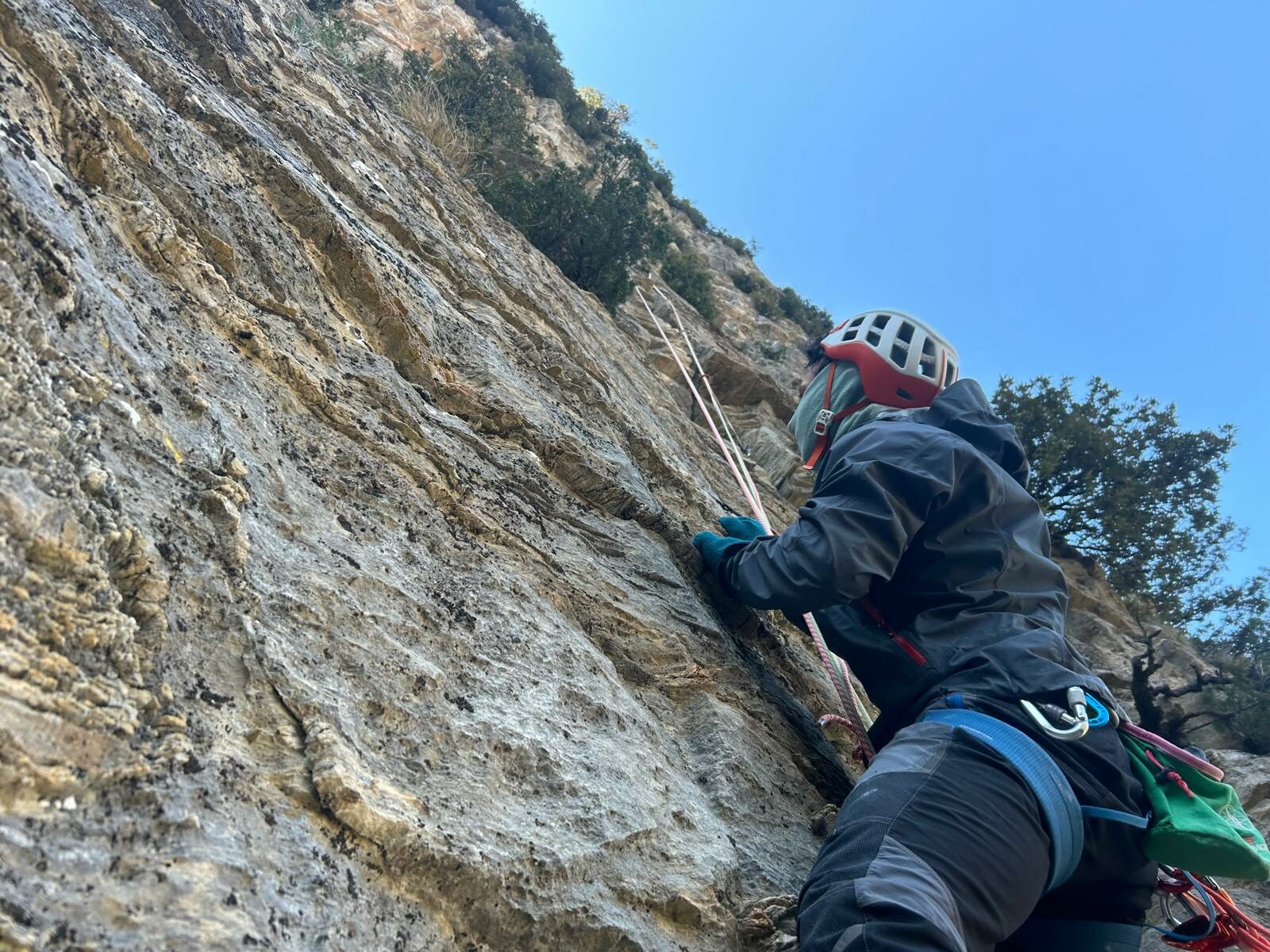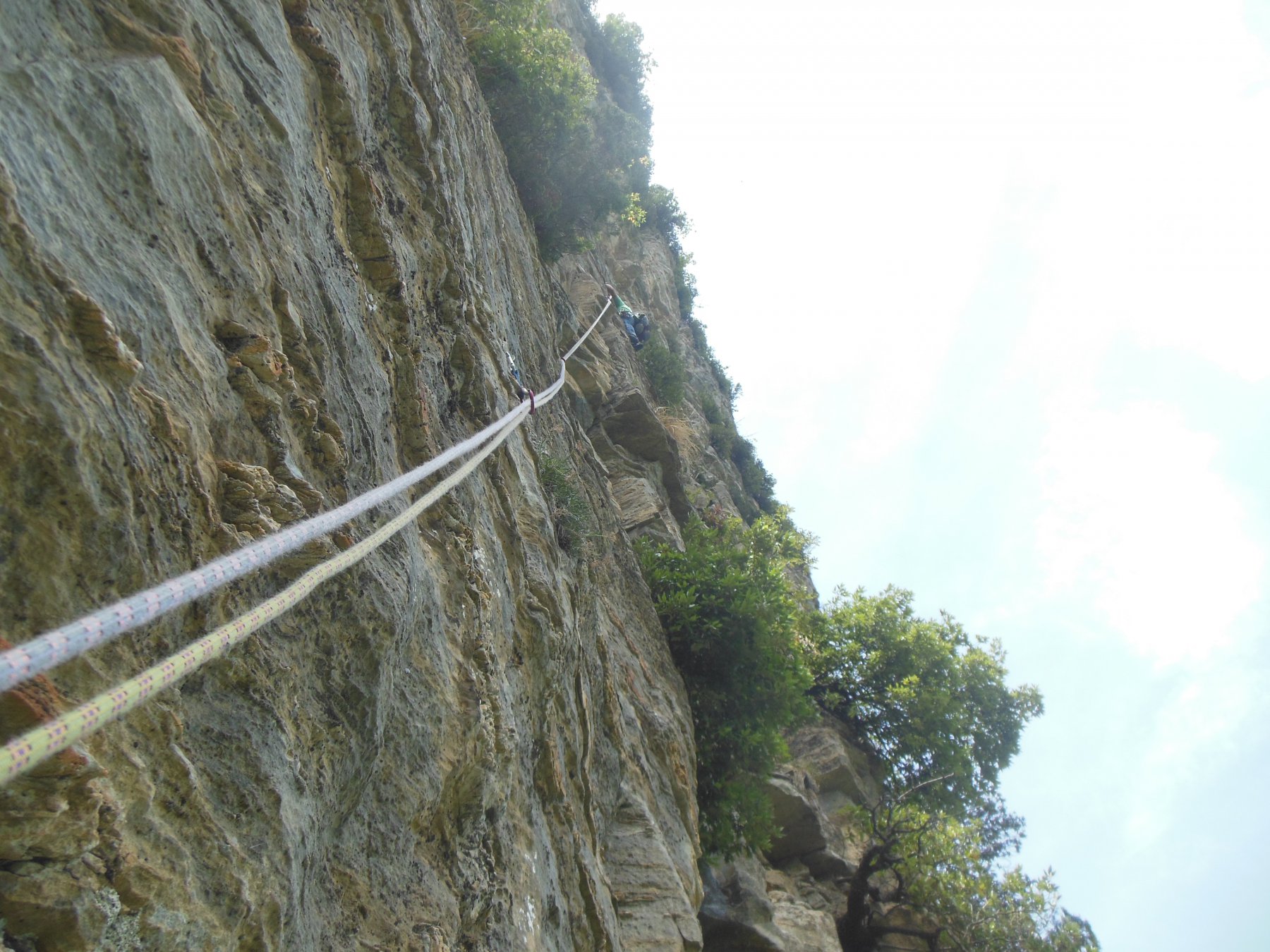 L3 bellissimo traverso a sx e muretto su ottimi appigli fino ad una sosta scomoda. 5c