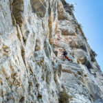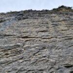 L3 Cambia la conformazione della roccia. Muro aggettante, tipica conformazione della zona a tacche orizzontali, spesso poco accennate. Crux obbligato di 7a, poi leggermente più facile fino alla sosta ma chiodatura rarefatta, 7a;