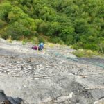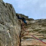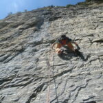 L4 Lunghezza più semplice ma su roccia peggiore. Un solo passo obbligato di 7a per faggiungere la sosta;