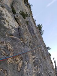 La via attacca all'estrema sx (faccia alla parete), in prossimità di un albero con cordino.