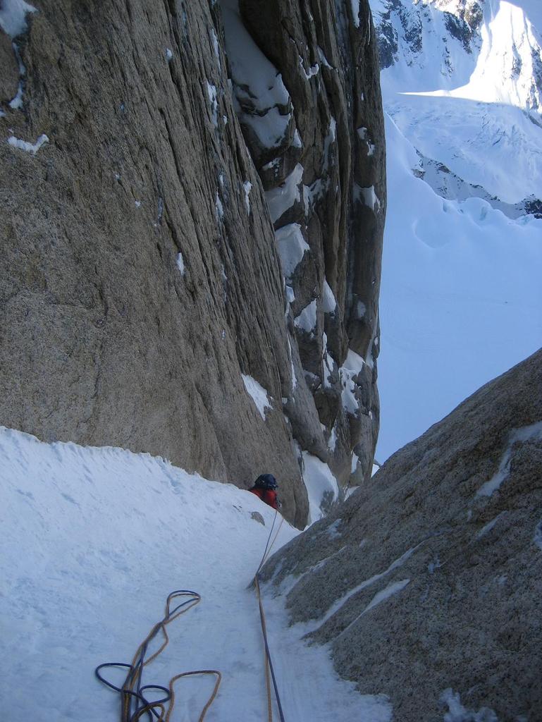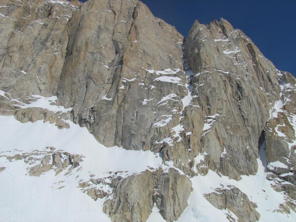 tenere presente che si è ben bene fuori dal mondo. non ci sono soccorsi che vengano a prendere in parete. se si riesce a riportarsi sul ghiacciaio l'aereoplanino del servizio taxi può venire a recuperare un malcapitato scalatore, ma solo se le condizioni sono sicure per lui. non è raro di dover aspettare giorni prima che passi il brutto tempo e gli aerei tornino in zona.