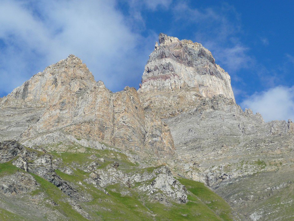 Prima lunghezza (30 m, 5c) su placca di roccia marnosa giallo-nera, uscita leggermente a sinistra. Si torna poi a destra per salire un bel diedro di calcare giallo e tagliente (30 m, 5b/c). Attraversata la prima cengia puntando leggermente a sinistra, segue una lunghezza ancora su calcare marnoso giallo-brunastro lungo una rampa-diedro fessurata (40 m, 6a facile). Qui si supera in obliquo a sinistra la fascia di calcare nodulare rosso-violaceo (“Couches Rouges”) con una lunghezza di 30 m (6a). Si mette quindi piede sul calcare grigio “urgoniano”, salendo sotto un tetto per evitarlo a sinistra e continuare su placca (30 m, 6a). A destra per un breve diedro fessurato su calcare giallo tagliente (20 m, 5c) si raggiunge la seconda cengia, che si attraversa puntando al pilastro di roccia calcarea grigio-biancastra soprastante (ancora il calcare “urgoniano”, ripetuto sull’altro lato della piega rovesciata). Qui comincia la sezione più difficile. Un primo tiro di 40 m su lame e fessure in uscita verticali e lisciotte (6b), quindi un secondo che oppone un passo di placca molto tecnico (30 m, 6b+, tre spit molto vicini), un terzo tiro breve (20 m) con uscita dalla sosta impegnativa e da capire (6a+/6b?). Da questo punto ancora una lunghezza di 50 m (5b+) obliqua a sinistra su scisto arenaceo nero (“Garschella Sandstein”), quindi un muro fessurato su roccia calcarea (40 m, 5c) e un ultimo breve risalto facile (20 m, terzo grado) portano alla vetta.