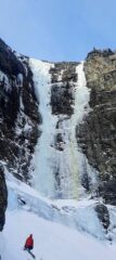 Splendida ed estetica cascata, che non oppone difficoltà particolari, trattandosi di un grande nastro di ghiaccio omogeneo. Risalire la prima parte meno ripida con due lunghezze con soste su ghiaccio. Una sosta su fix singolo sotto le rocce a destra del muro centrale. Proseguire con altre 3/4 lunghezze fra gli 80/85 fino a sezioni a 90 gradi. Soste su ghiaccio e calate su Abalakov, talvolta già in posto.