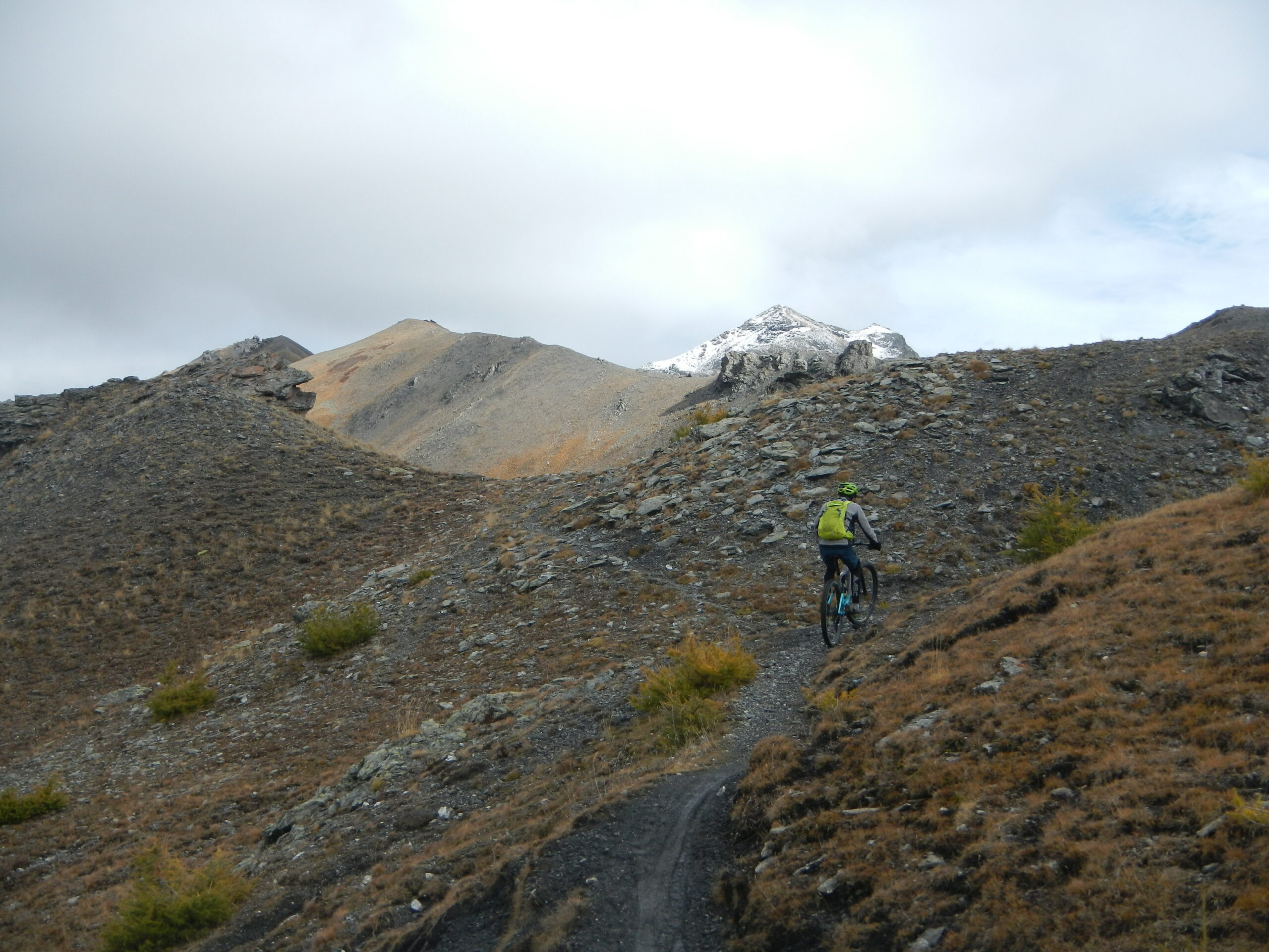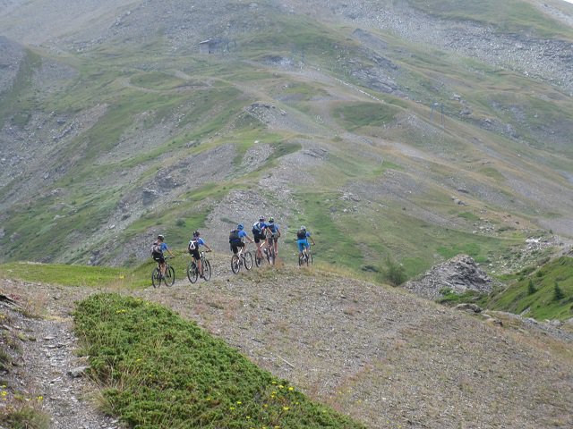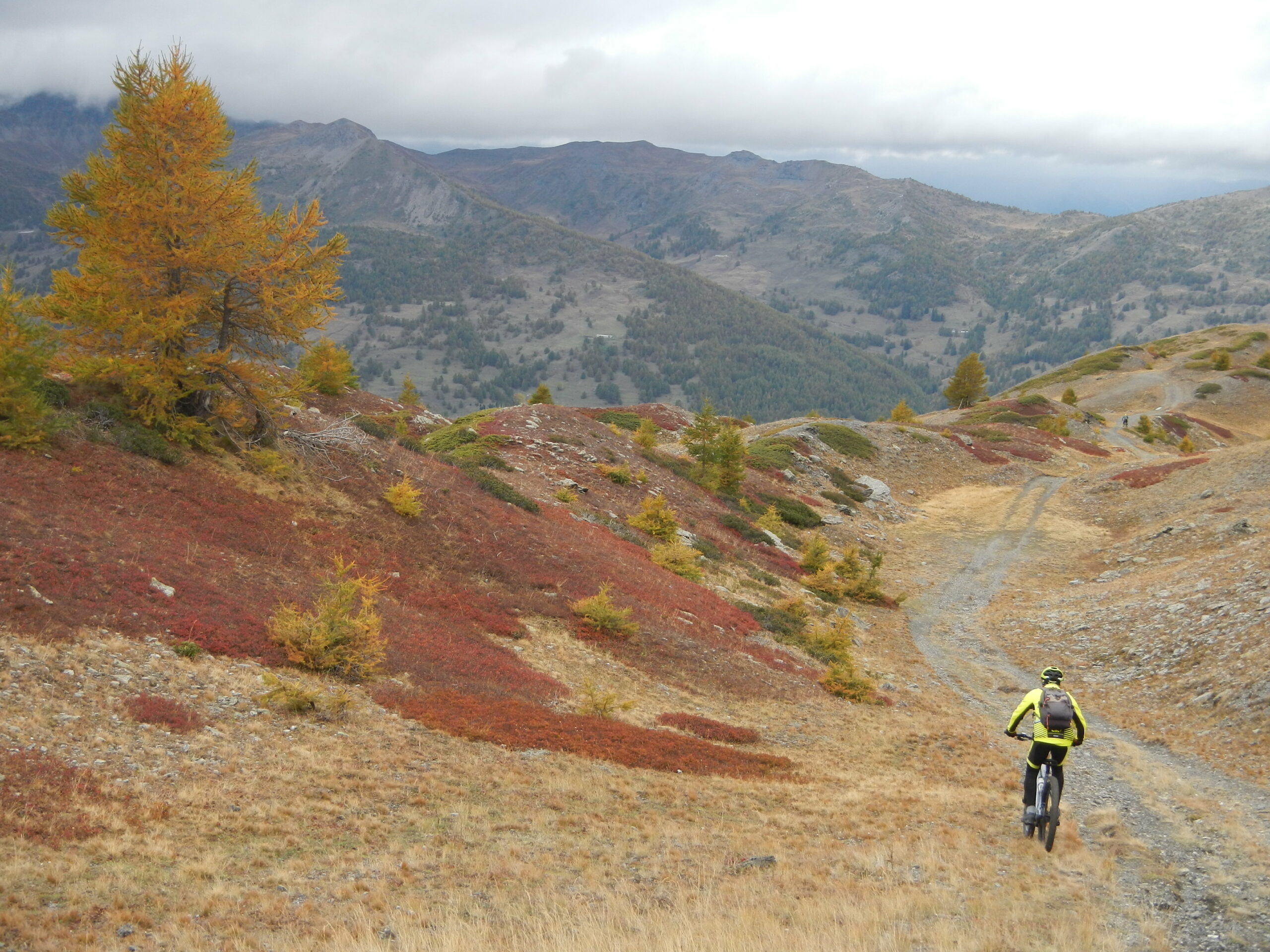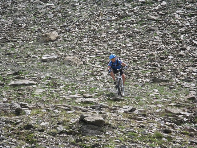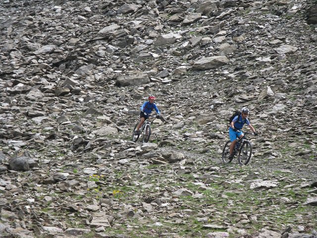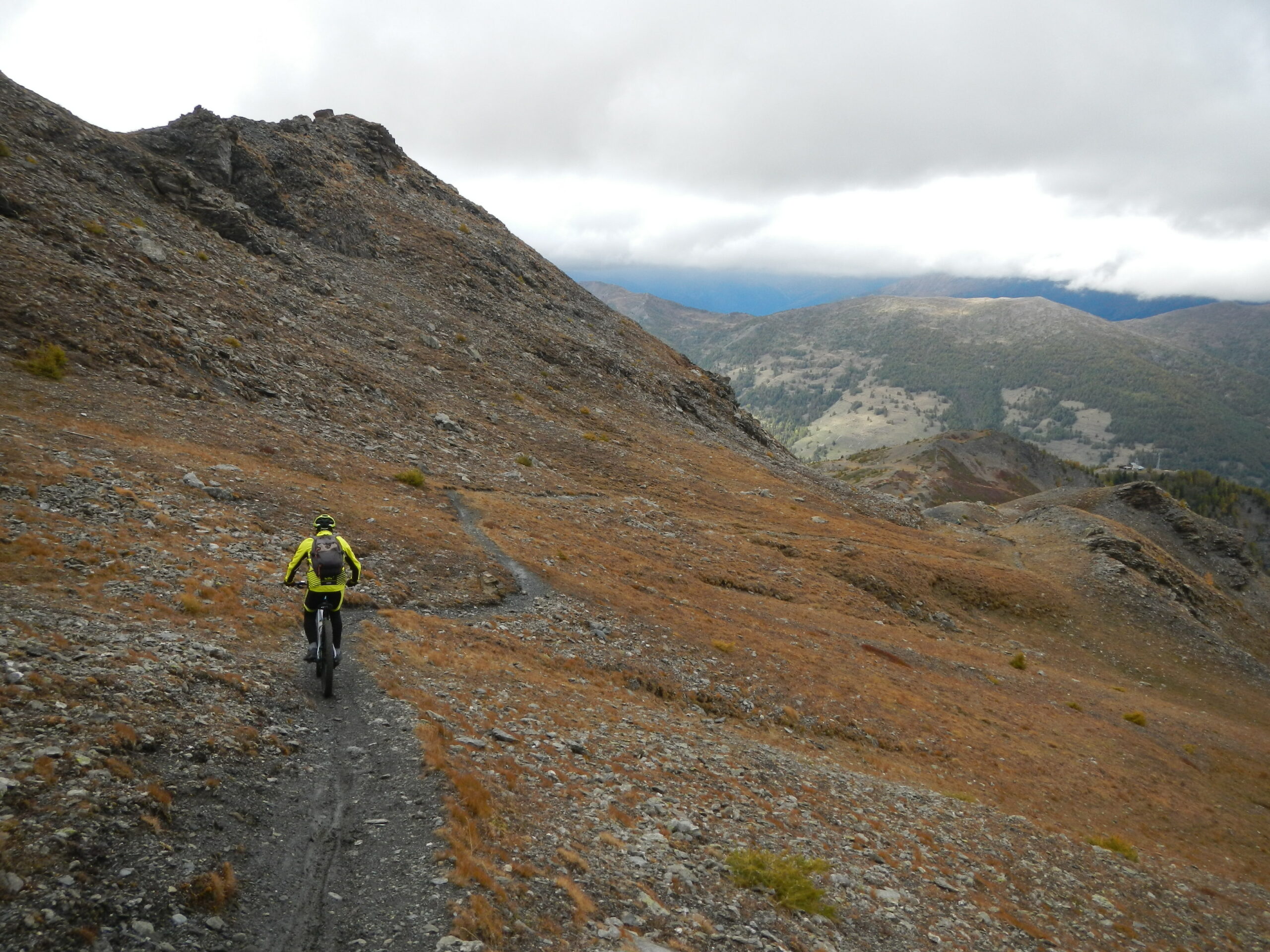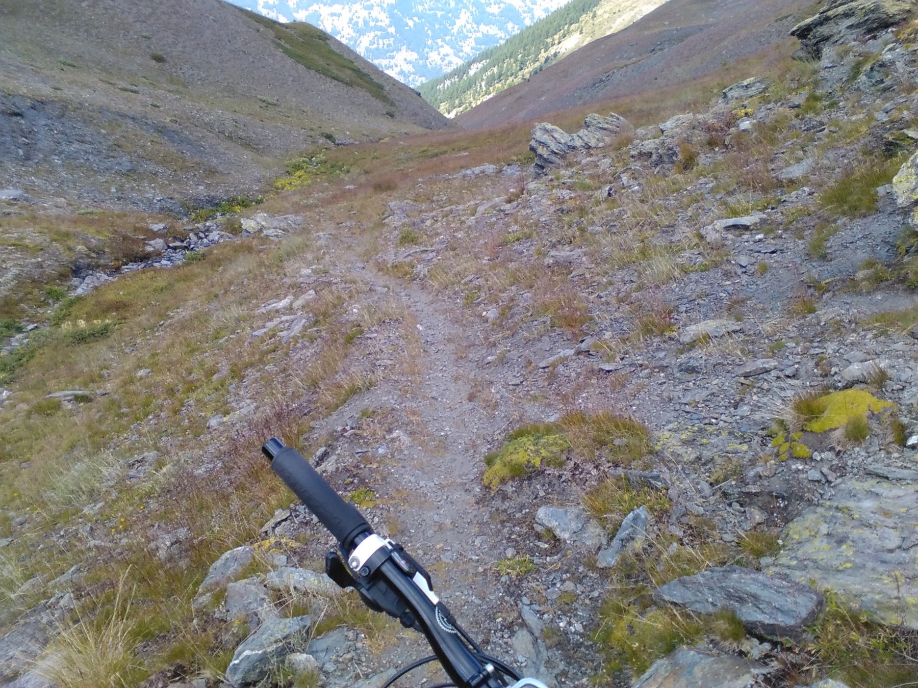 Per la discesa ci sono più possibilità: la prima è per il vallone del Mendia, negli ultimi anni pare che sia via via peggiorato diventando poco ciclabile, mancano però aggiornamenti a riguardo. Si scende sul percorso di salita fino al Colle del Pis, da qui ancora qualche metro verso gli impianti per prendere una traccia poco visibile che parte alla nostra destra (consigliabile guardarsela già in salita e poi prestare attenzione in discesa perchè è veramente poco visibile) a quota 2550 m circa e ravanando un po’ ci porta nel Vallone del Mendie. Il sentiero si intravede abbastanza ma è comunque consigliabile avere dietro il GPS con il sentiero segnalato, in alternativa siccome il sentiero scende più o meno sempre al fianco del Rio Mendie basta tenere sott’occhio quest’ultimo per orientarsi. Man mano che si scende comunque il sentiero diventa evidente e difficilmente ci si può perdere.