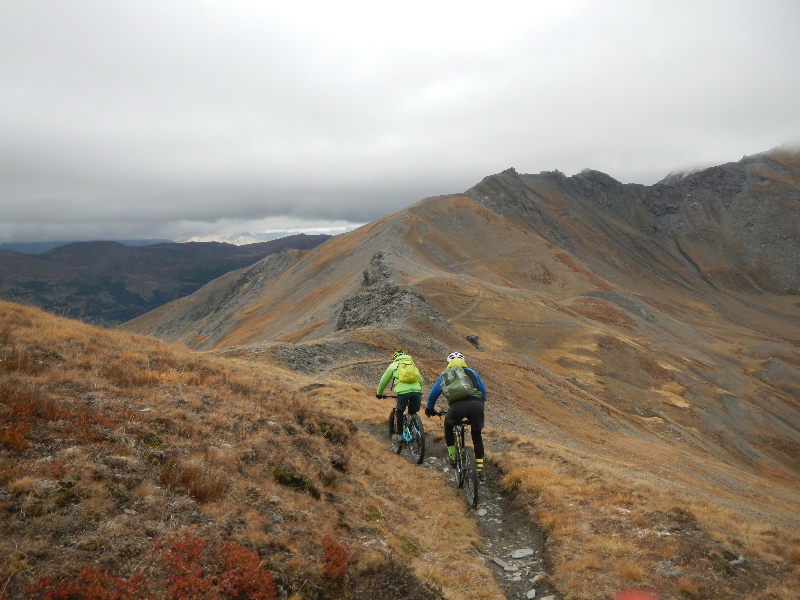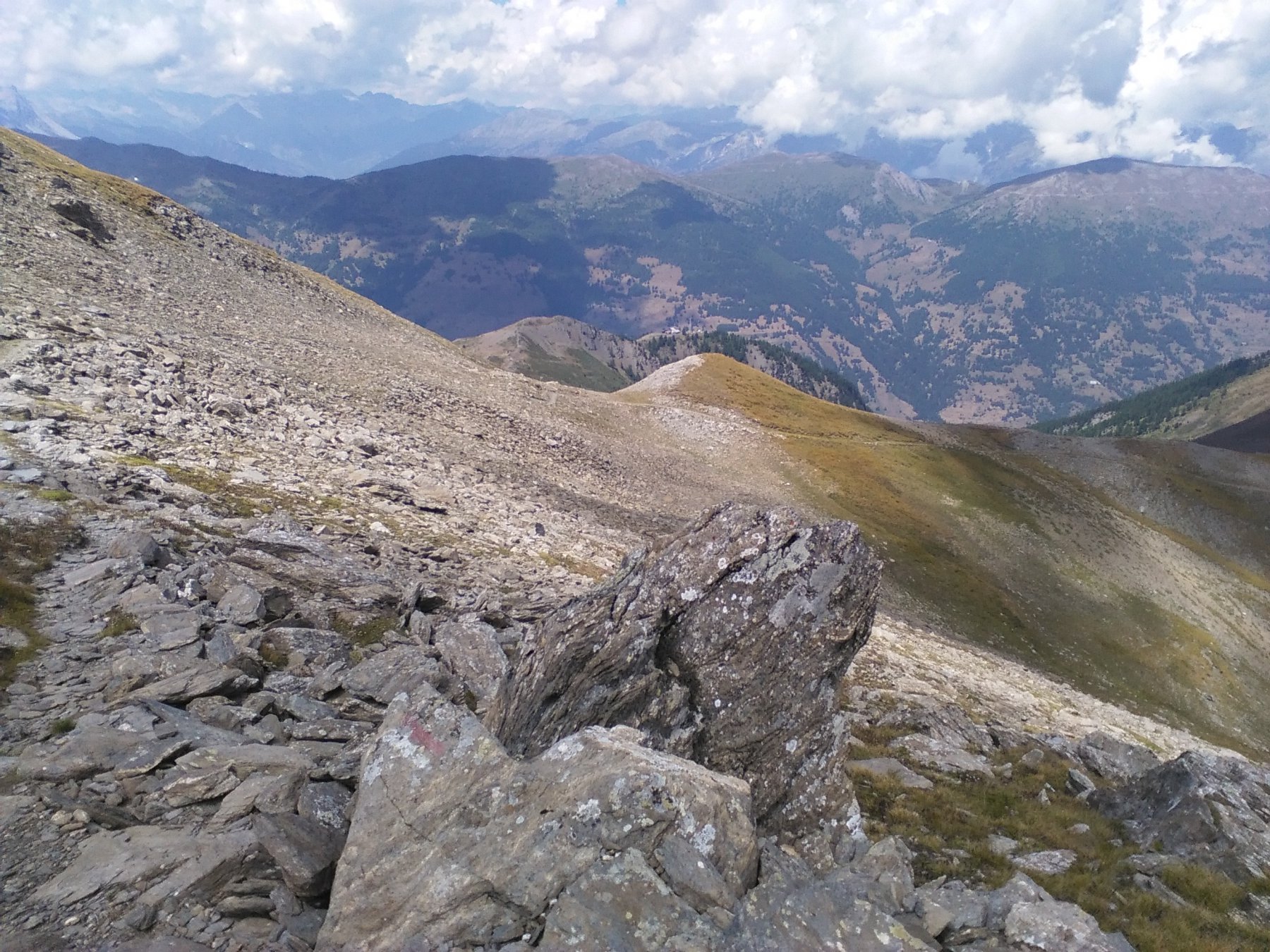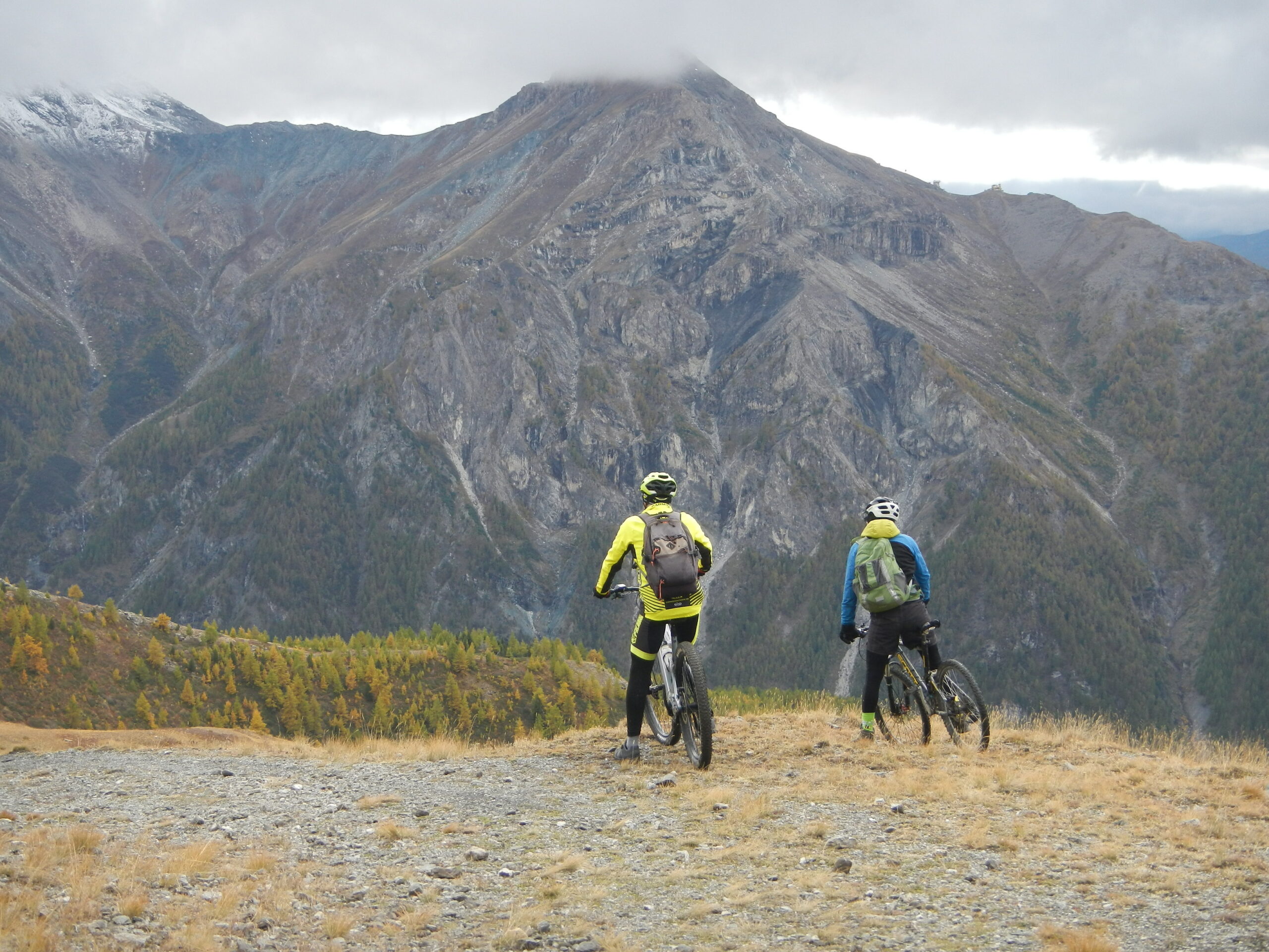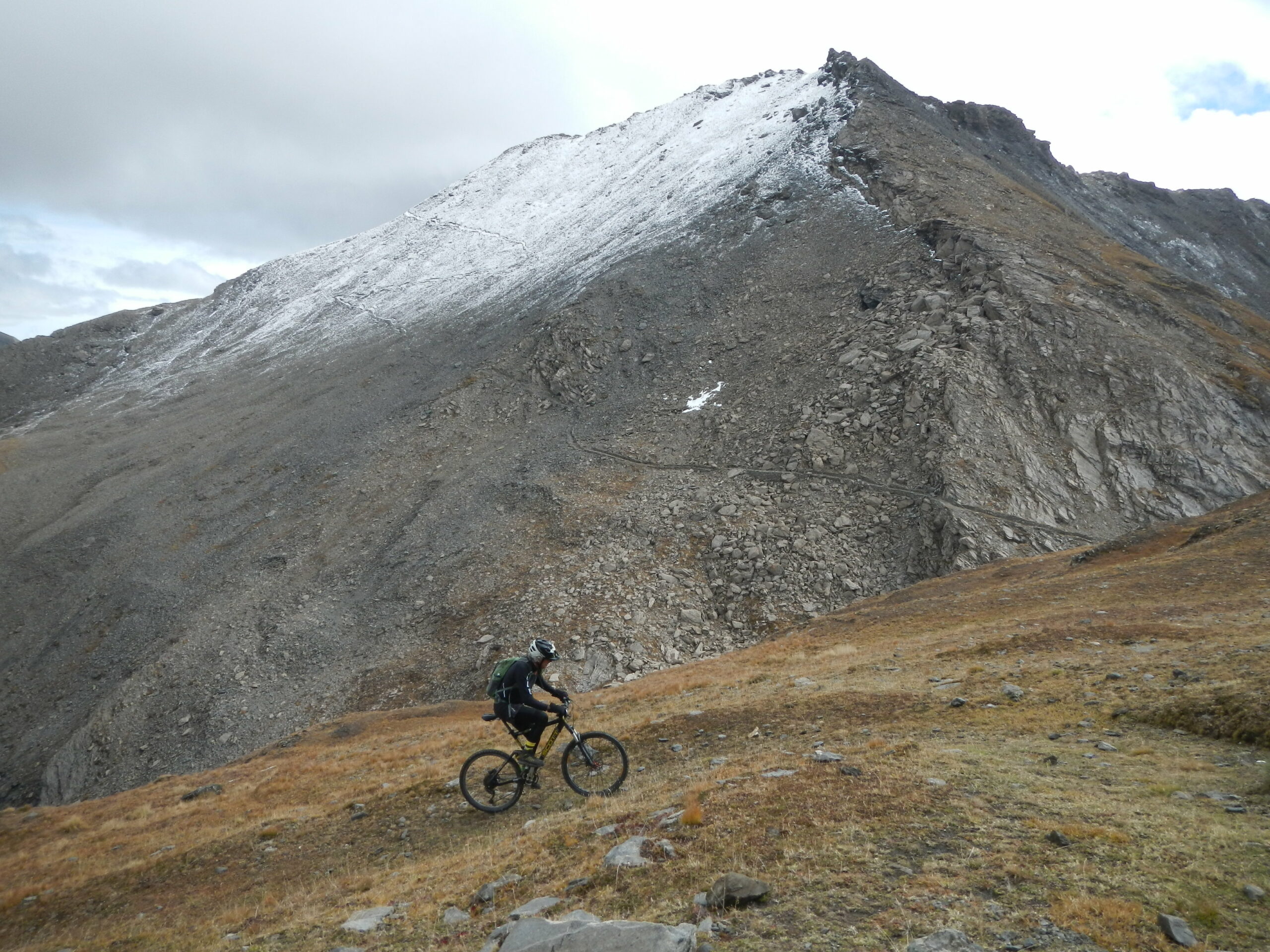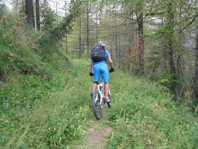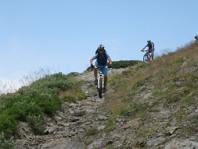 Per la discesa ci sono più possibilità: la prima è per il vallone del Mendia, negli ultimi anni pare che sia via via peggiorato diventando poco ciclabile, mancano però aggiornamenti a riguardo. Si scende sul percorso di salita fino al Colle del Pis, da qui ancora qualche metro verso gli impianti per prendere una traccia poco visibile che parte alla nostra destra (consigliabile guardarsela già in salita e poi prestare attenzione in discesa perchè è veramente poco visibile) a quota 2550 m circa e ravanando un po’ ci porta nel Vallone del Mendie. Il sentiero si intravede abbastanza ma è comunque consigliabile avere dietro il GPS con il sentiero segnalato, in alternativa siccome il sentiero scende più o meno sempre al fianco del Rio Mendie basta tenere sott’occhio quest’ultimo per orientarsi. Man mano che si scende comunque il sentiero diventa evidente e difficilmente ci si può perdere.