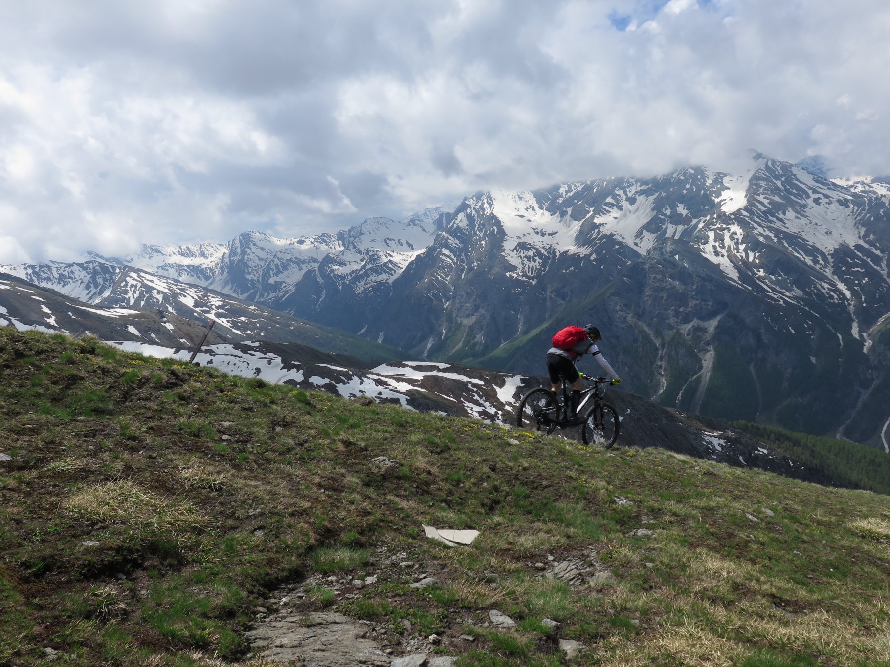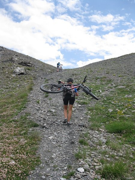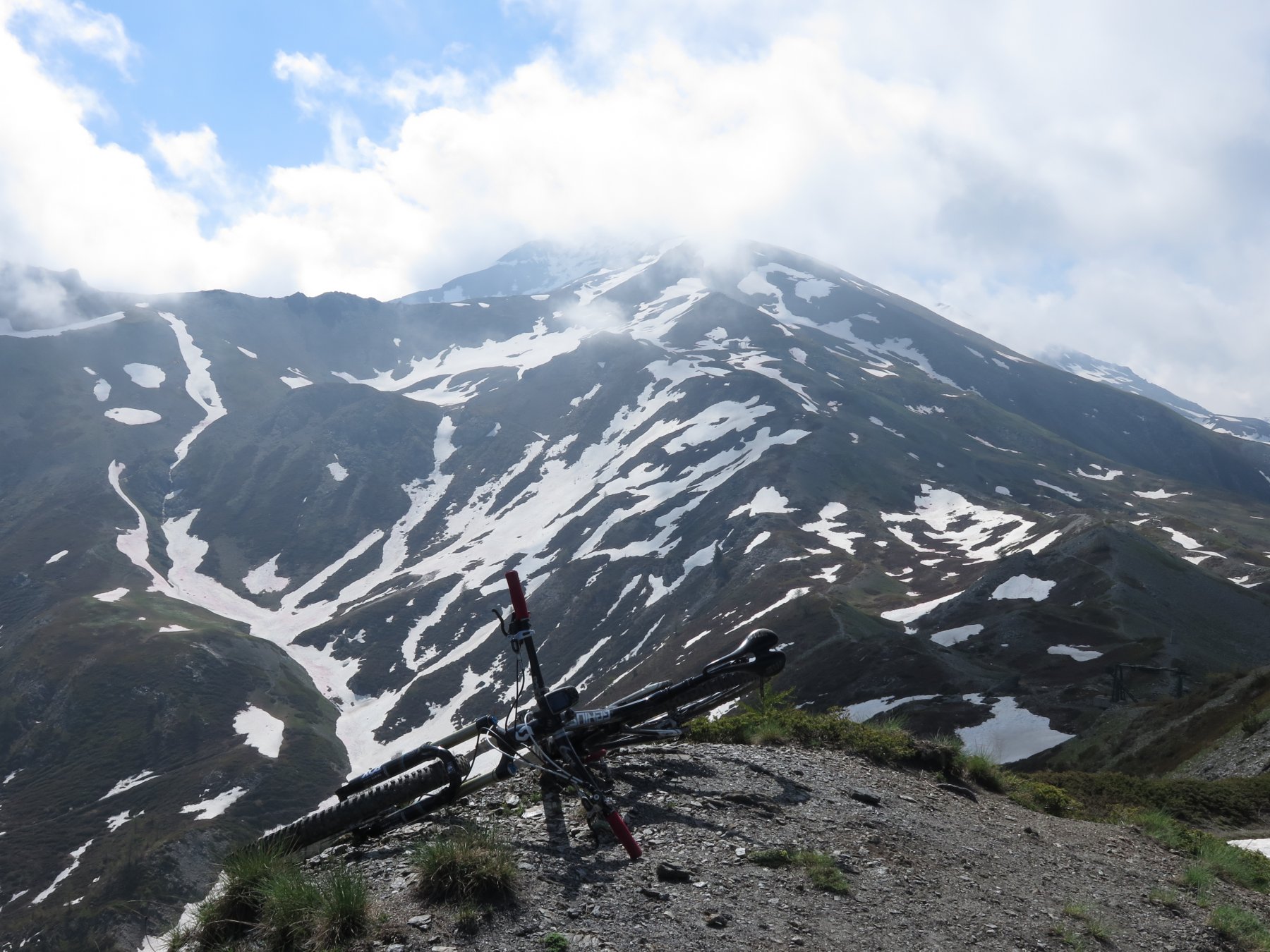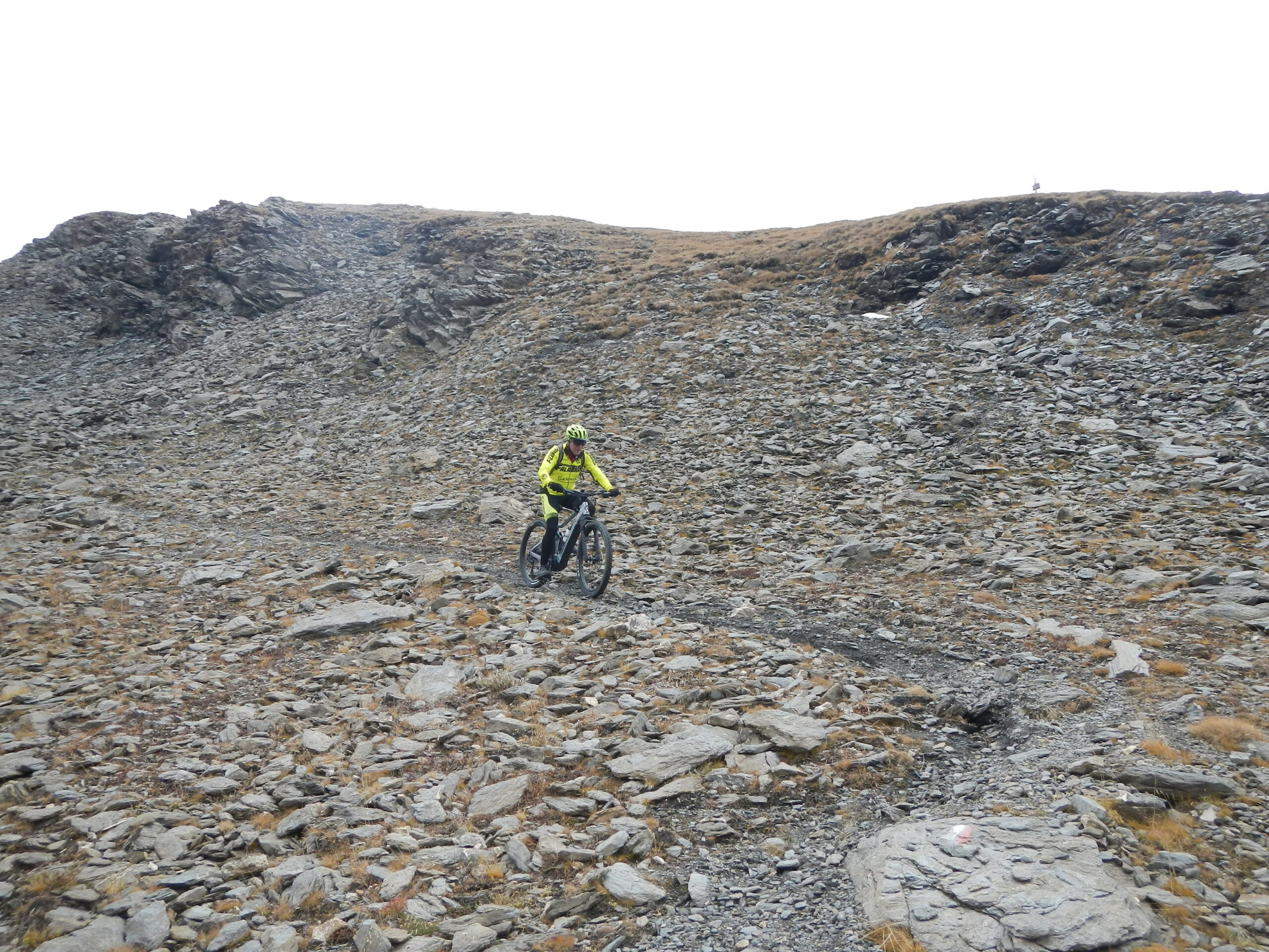 Ora proseguiamo in cresta dove è presente un bellissimo sentiero quasi interamente ciclabile che porta verso l’arrivo dello skilift “Belotte”, da dove si vede già chiaramente il Colle del Pis dritto davanti a noi. Lo raggiungiamo su sentiero abbastanza ripido dove è consigliabile portare la bici in spalla.