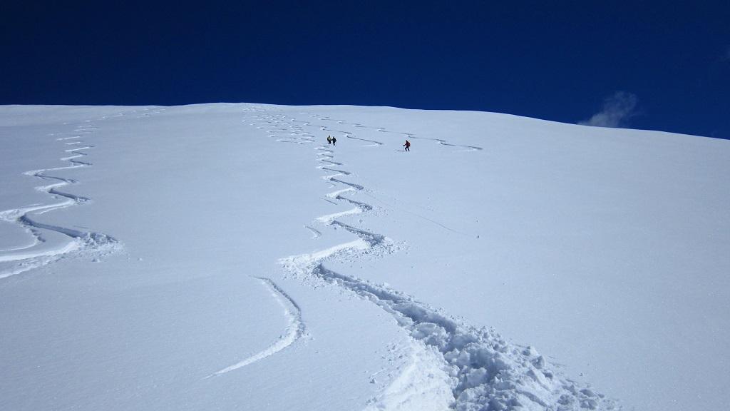 Gran bella gita con spennellate da sogno!!!! Partenza da Pattemuche risalendo fedelmente le piste ormai prive di pistaioli, poi verso il vecchio skifit ormai in disuso seguendo bella traccia che arriva sulla dorsale e poi senza problemi fino in vetta. Discesa ottimamente descritta da Andrea, per evitare la zona del distacco, vedi foto, siamo scesi nel bosco su pendii esposti a sud su neve più pesante ma sempre sciabile fino a raggiungere la pista di fondo nei pressi di Laval. gran bella traversata!!!