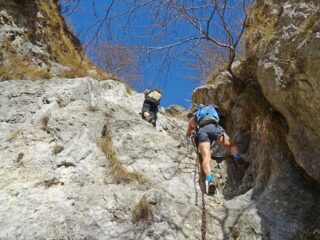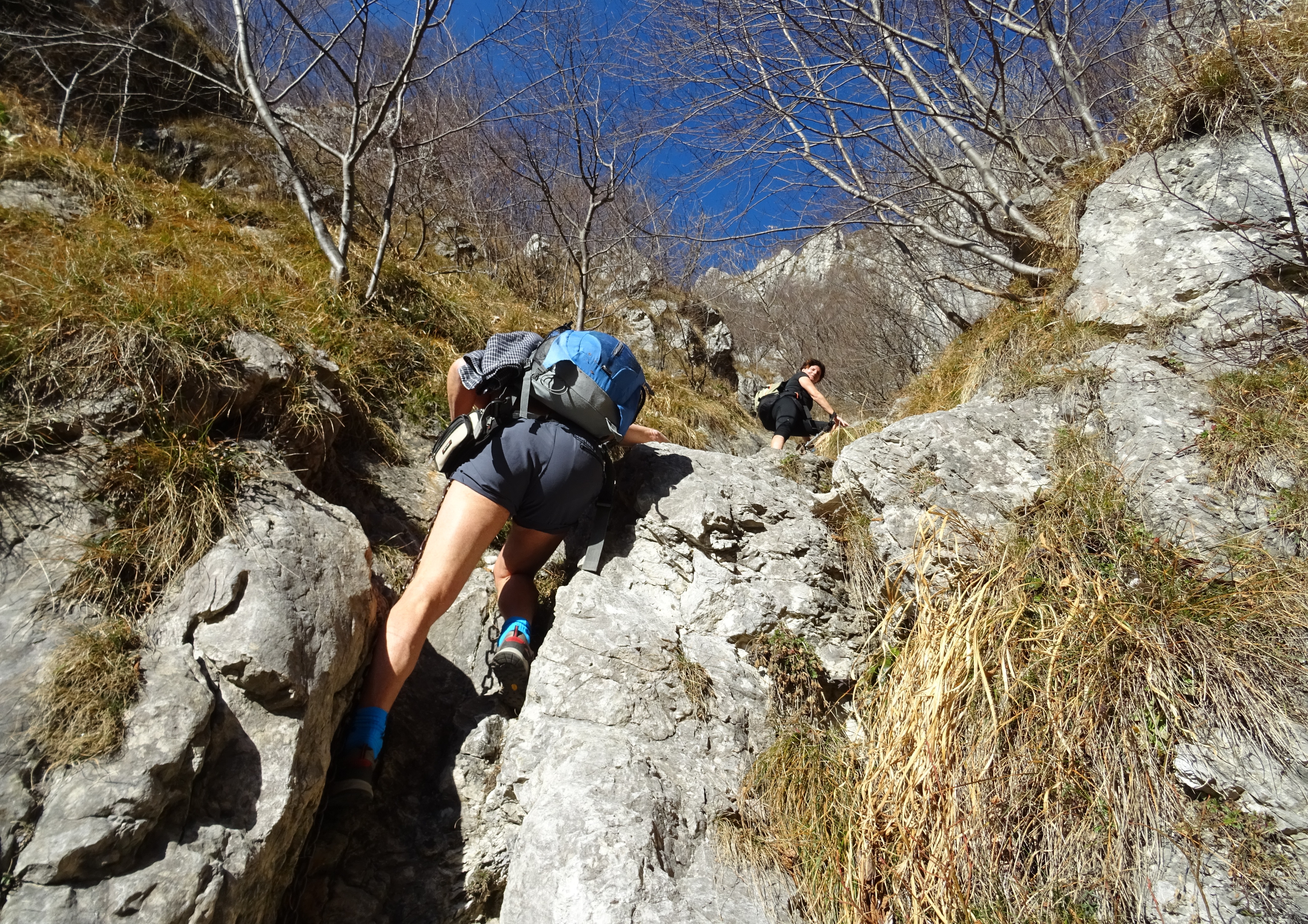 Ultima uscita dell’Anno Domini 2021. Con la colonnina del mercurio impazzita e schizzata alle stelle e con la penosa situazione neve in zona, organizzo un’uscita last minute nella zona di Lecco, avente in mente come primo obbiettivo di non pestar neve. Partiti da Belvedere di Valmadrera salendo verso la Sorgente Sambrosera dove imbuchiamo il canalone Belasa. Canale in ottime condizioni tutto a secco da neve e ben asciutto, quest’ultimo requisito indispensabile. Catene sui punti chiave in ottimo stato e a prova di bomba, che aiutano a passare in sicurezza i tratti più ostici. Il canale l’abbiamo fatto integralmente fino ad uscire in cresta, da li raggiungiamo ancora per un tratto ferrato il balcone panoramico del M.Moregallo. Da li ritorno alternativo ad anello traversando verso il Rif. S.E.V. 1225mt. (chiuso) con puntatina al Corno di Canzo orientale 1232mt. dove scendiamo verso la provvidenziale fonte Acqua del Fò 1000mt. Continuiamo poi prendendo il sentiero medioevale bollato di verde che scende passando sotto il Corno del Rat e la strada acciottolata che scende fino a Valmadrera dove chiudiamo l’anello.