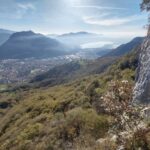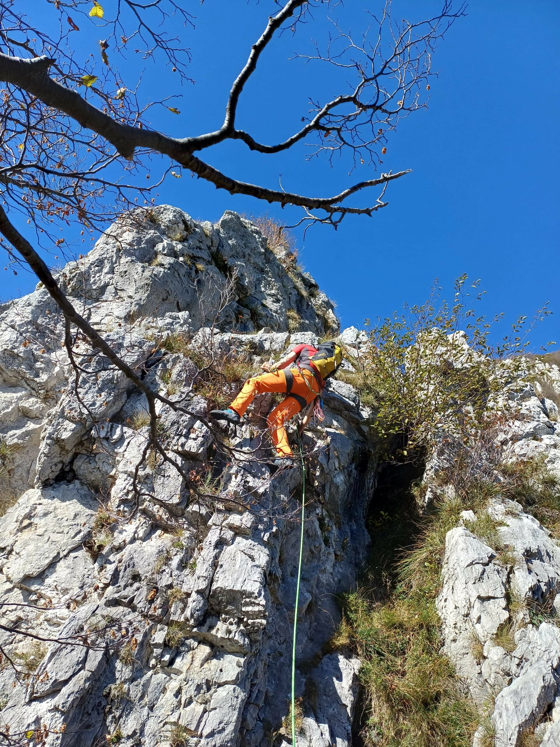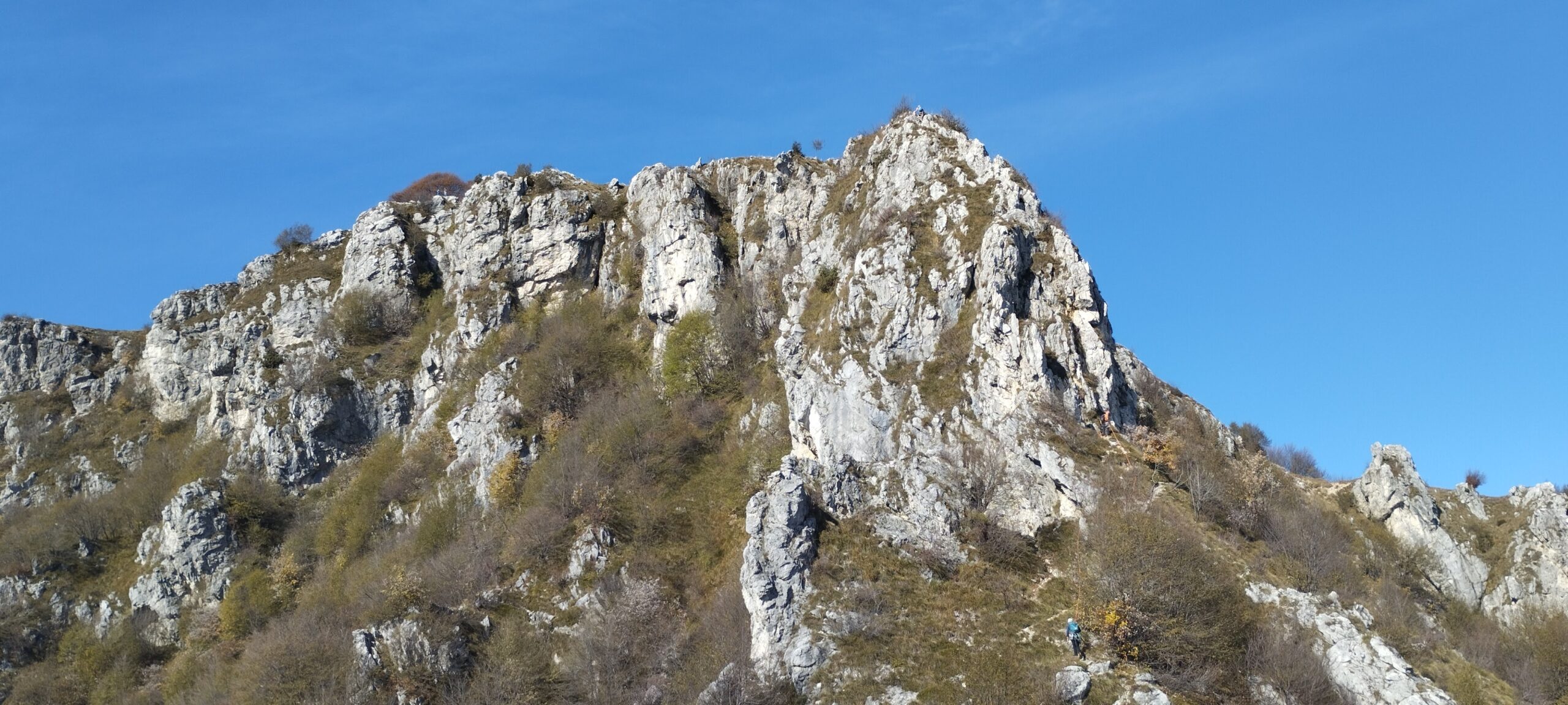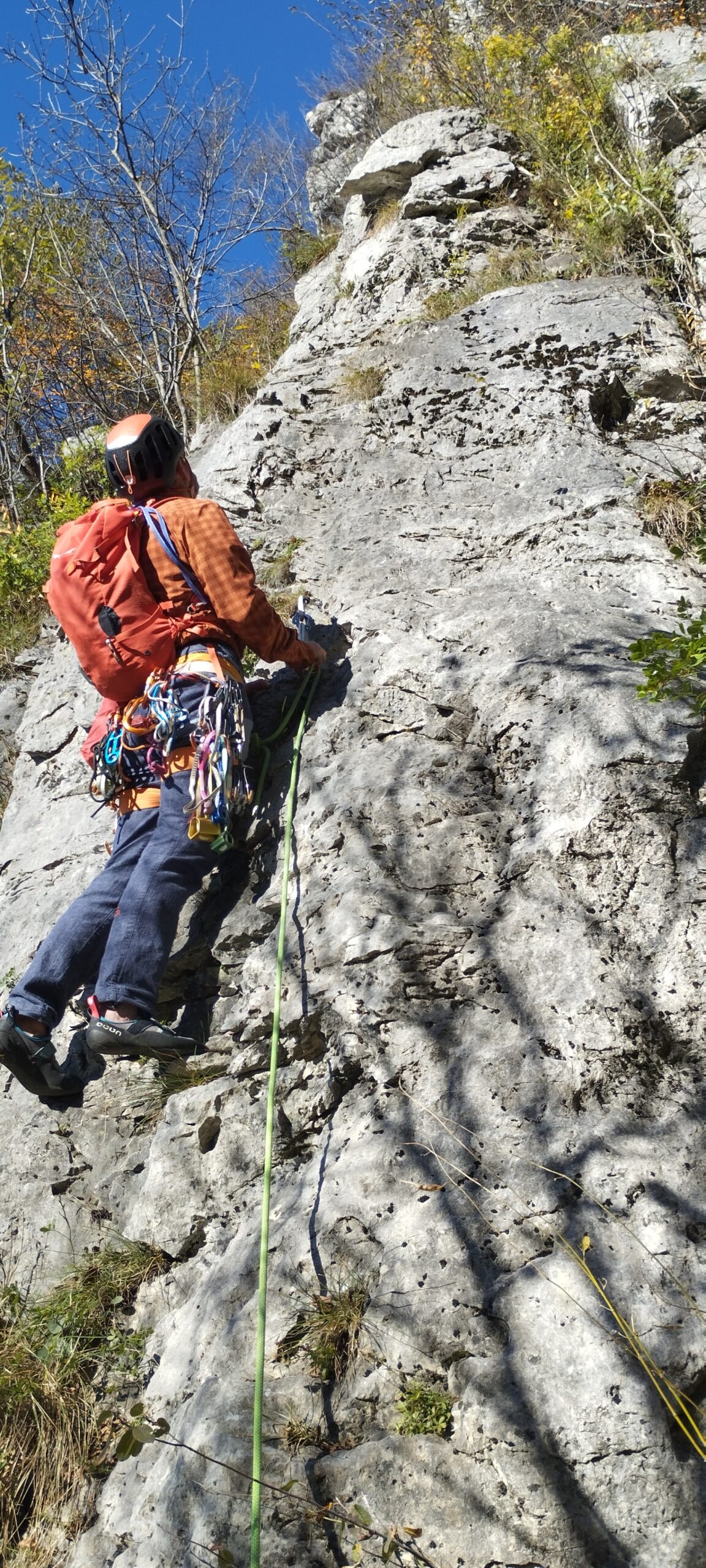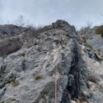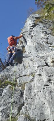- L6: attraversare il successivo canale di erba e piante a dx e attaccare il pilastrino successivo (attenzione, roccia poco salda!!!), che si percorre interamente (IV-), rientrando poi più facilmente verso sx, e percorrendo poi il successivo tratto semplice di cresta (III) per andare a sostare su alberelli più avanti.