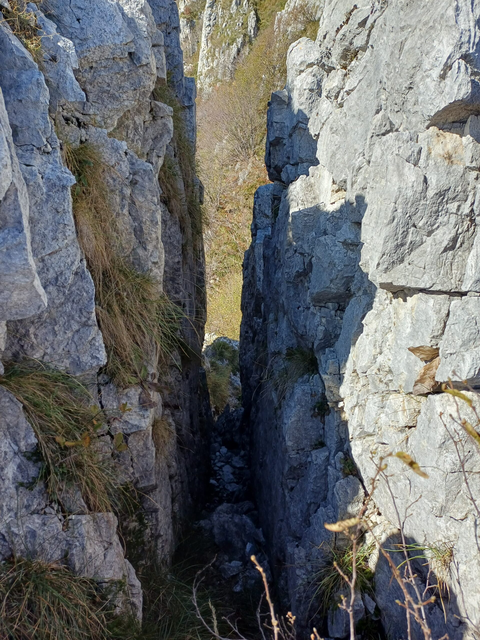 Si percorrono pochi metri in piano, fino a scendere ad un intaglio con pianta (II), risalendo poi dalla parte opposta facilmente (III), prestando attenzione all’instabilità di alcune rocce, fino in cima ad un pilastrino, poi in piano per tracce di sentiero e per una successiva rampetta erbosa fino a raggiungere un curioso corridoio- camino che si scende facilmente, scendendo anche le successive facili roccette (I+) fino ad un intaglio alla base del muretto successivo.