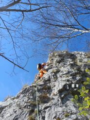 - L7: attaccare il muretto verso sx fino ad un chiodo, dal quale si può uscire sia verso sx (IV+), che più facilmente, verso dx (IV). Segue poi un tratto semplice, fino a sostare su albero alla base del muretto successivo.