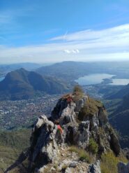 Ci sono diverse possibilità. O si percorre il sentiero attrezzato fino alla bocchetta delle Moregge, dalla quale ci si può sbizzarrire (scendendo a Sambrosera, andando ai Corni piuttosto che al rifugio SEV, ecc) o si scende dalla cima verso destra fino alla bocchetta del Moregallo, da cui si può rientrare a Sambrosera tramite il sentiero nr. 6, che passa in prossimità dell’attacco della via; oppure ancora si prosegue verso Sant’Isidoro e si scende direttamente alla cappella VARS tramite il sentiero Paolo ed Eliana, o infine scendere a Sant’Isidoro e da qui a Malgrate, dove, se è stagione, ci si può pure fare il bagno!