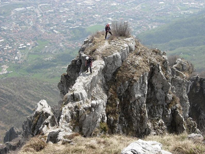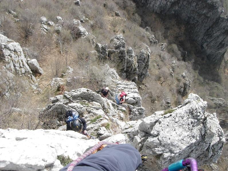 Bella e divertente! Non sarà una “grande” salita ma richiede già, considerato il dislivello complessivo, un discreto impegno. Già arrivare all’attacco sono 600 metri di dislivello su sentiero piuttosto ripido. La roccia è quasi sempre ottima, a parte qualche breve tratto un po’ unto e, causa la friabilità, il canalino iniziale del tiro che precede il ponte di pietra. A parte il chiodo con cavetto metallico in via non ci sono altri ancoraggi intermedi. Comunque è tutto facilmente proteggibile, a parte il muretto dell’ottavo tiro che richiede almeno un friend medio-grande. Solo quattro stelline per l’affollamento, in particolare nella prima parte. Infatti siamo arrivati all’attacco alle 9,40 ed abbiamo iniziato ad arrampicare alle 10,30!! Per la discesa, seguendo i consigli di altri escursionisti, abbiamo scelto il percorso che passa dalla Bocchetta di Moregge. Prestare attenzione nella prima parte, quella con le catene, a non smuovere nulla per non correre il rischio di lapidare qualche malcapitato. Per il resto tutto bene: bel panorama, in particolare dalla cima, giornata passabile anche se con cielo velato e, soprattutto, bella e divertente compagnia. Oggi eravamo in sei, divisi in tre cordate: Lili/Luigi, Antonio/Michele e Fausto ed io.
