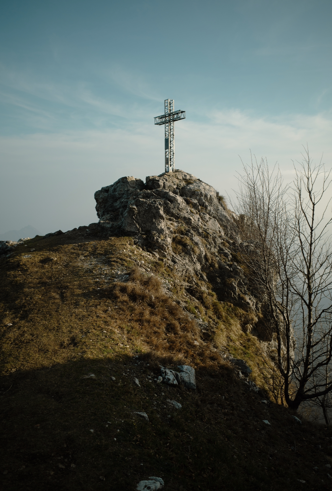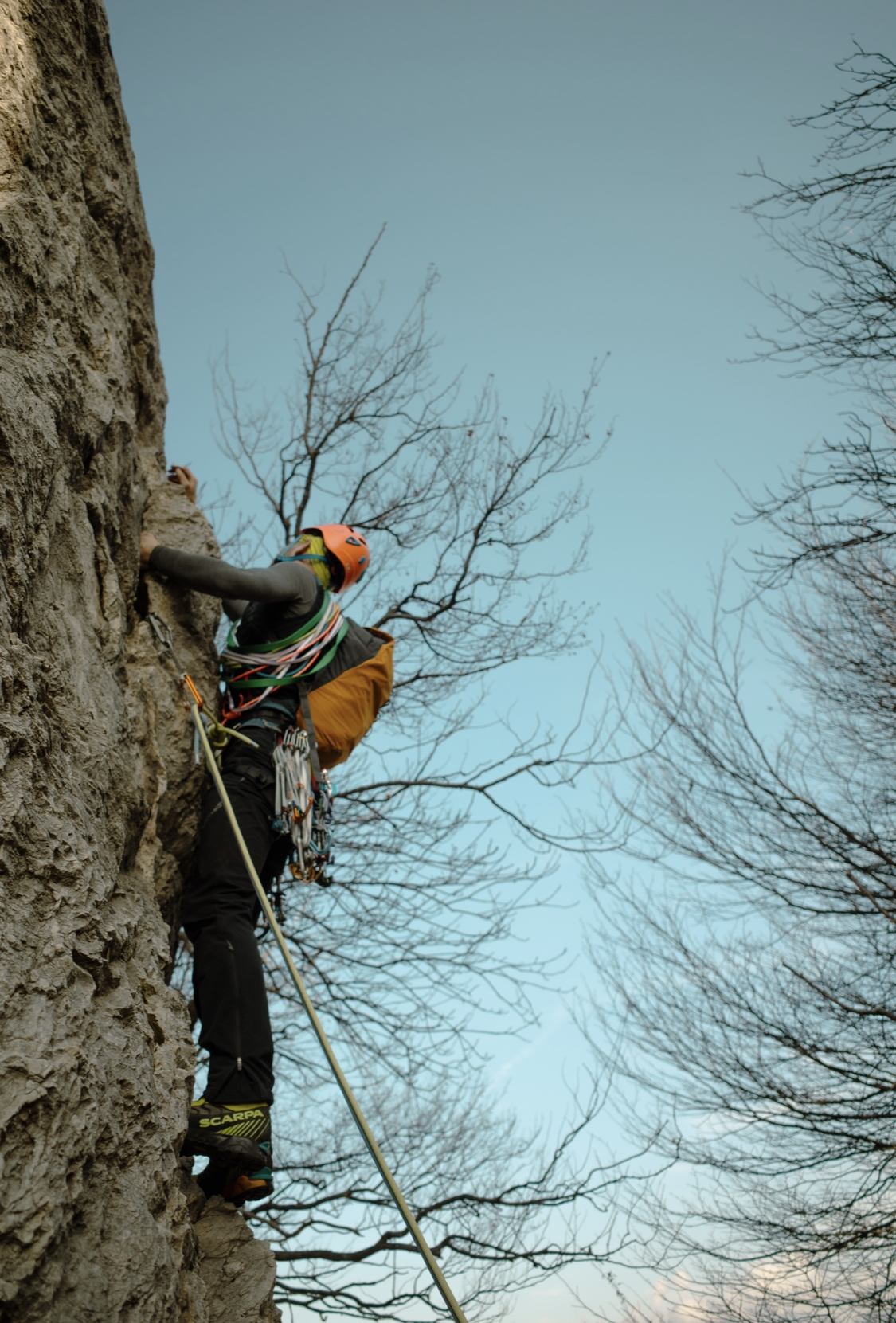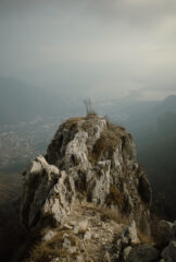 Fatta in cordata da tre che ha allungato i tempi all’inverosimile, lo sconsiglio vivamente. Cresta molto facile, si va cercando il difficile senza cercare di aggirare sull’erba, molto divertente e propedeutica con gli scarponi. Prima del famoso camino (che ha la fama di essere untissimo ma non lo è) consiglio di stare tutto a sinistra sul filo di cresta, invece che tutto a destra con vegetazione: si passa un tratto delicato molto esposto protetto da un chiodo, poi si fa sosta poco più avanti su spuntone. Arrivati alla fine del tratto roccioso di cresta consiglio anche gli ultimi due tiri, sull’ultimo con roccia brutta avrei scelto di passare a sinistra col senno di poi, la roccia sembra più bella è in generale più divertente.